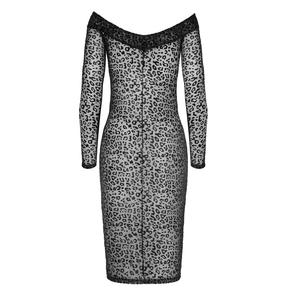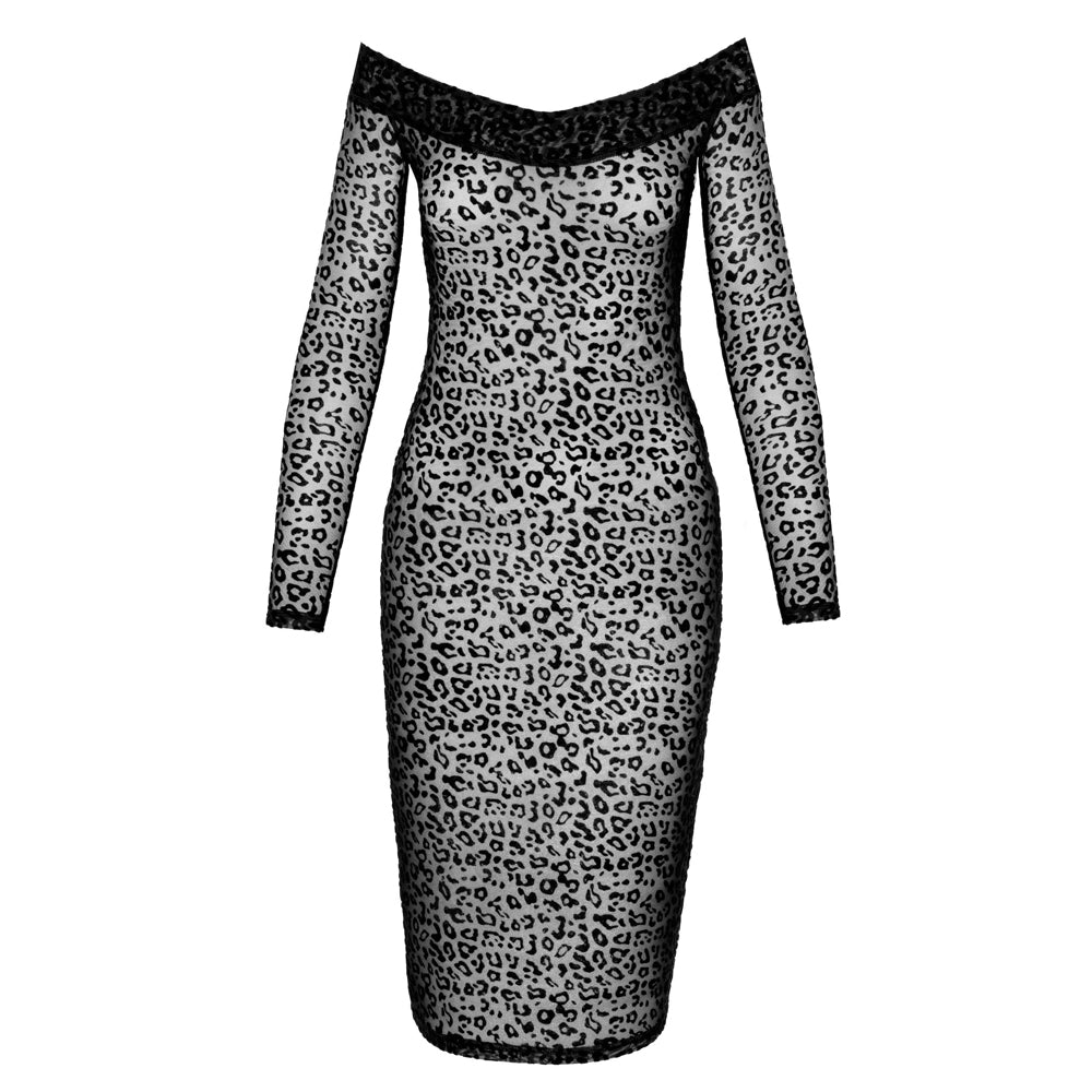 Get your claws out in Noir Handmade's® Sheer Leopard Flock Off-Shoulder Midi Dress!
