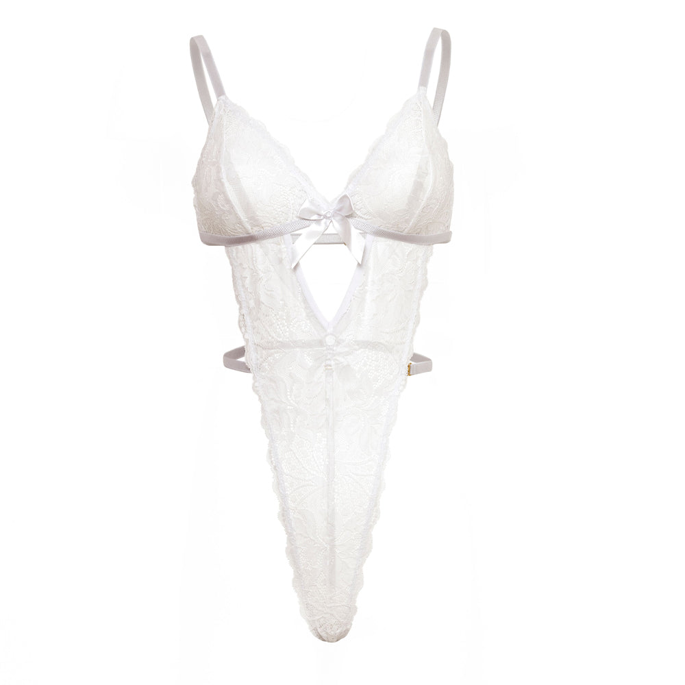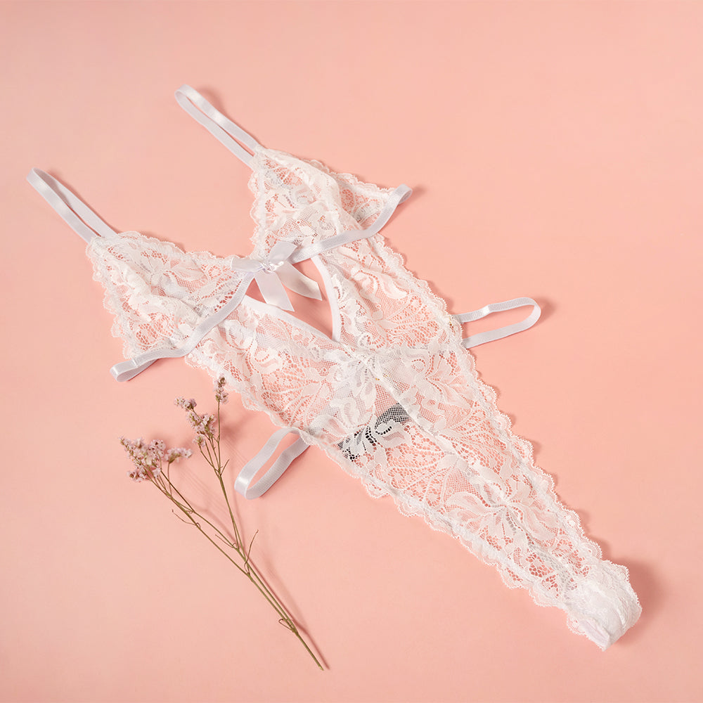 This barely-there lingerie one-piece is crafted from soft lace with scalloped edges and a feminine floral pattern to add a touch of romance to this racy look. The soft, wire-free triangle cups meet above a sternum cutout, topped with a sweet bow detail that draws the eye to your cleavage. The cutout waist and ultra-high-cut leg accentuate your body's curves, elongating your legs at the same time for a lean, lust-worthy silhouette so you can strut your stuff with confidence! The view is even more tantalising in the back, featuring a V-shaped design with size-adjusting strap sliders and a tiny G-string rear accented with another bow to expose your buns to the max!