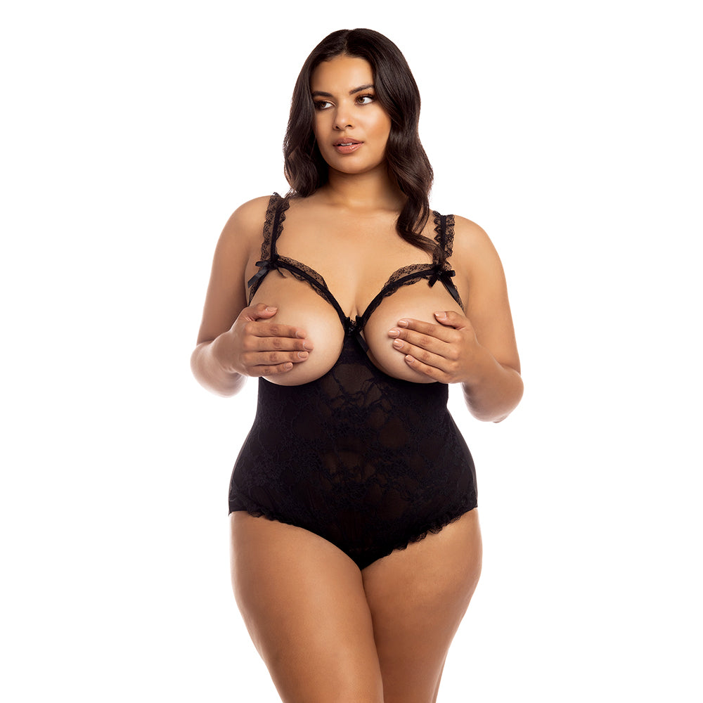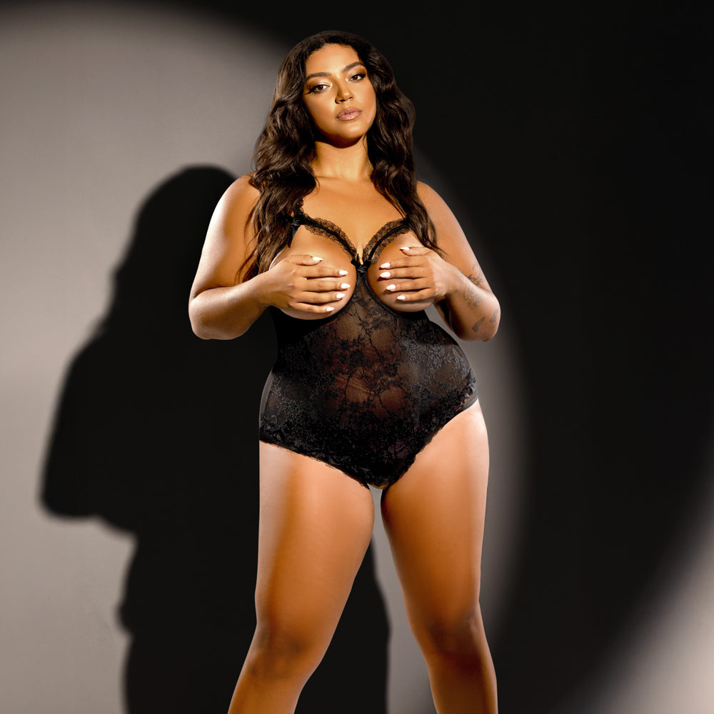 Put on an unforgettable show in the Plus-Size Amber Crotchless Cupless Open-Rear Lace Teddy from Oh Là Là Chéri!