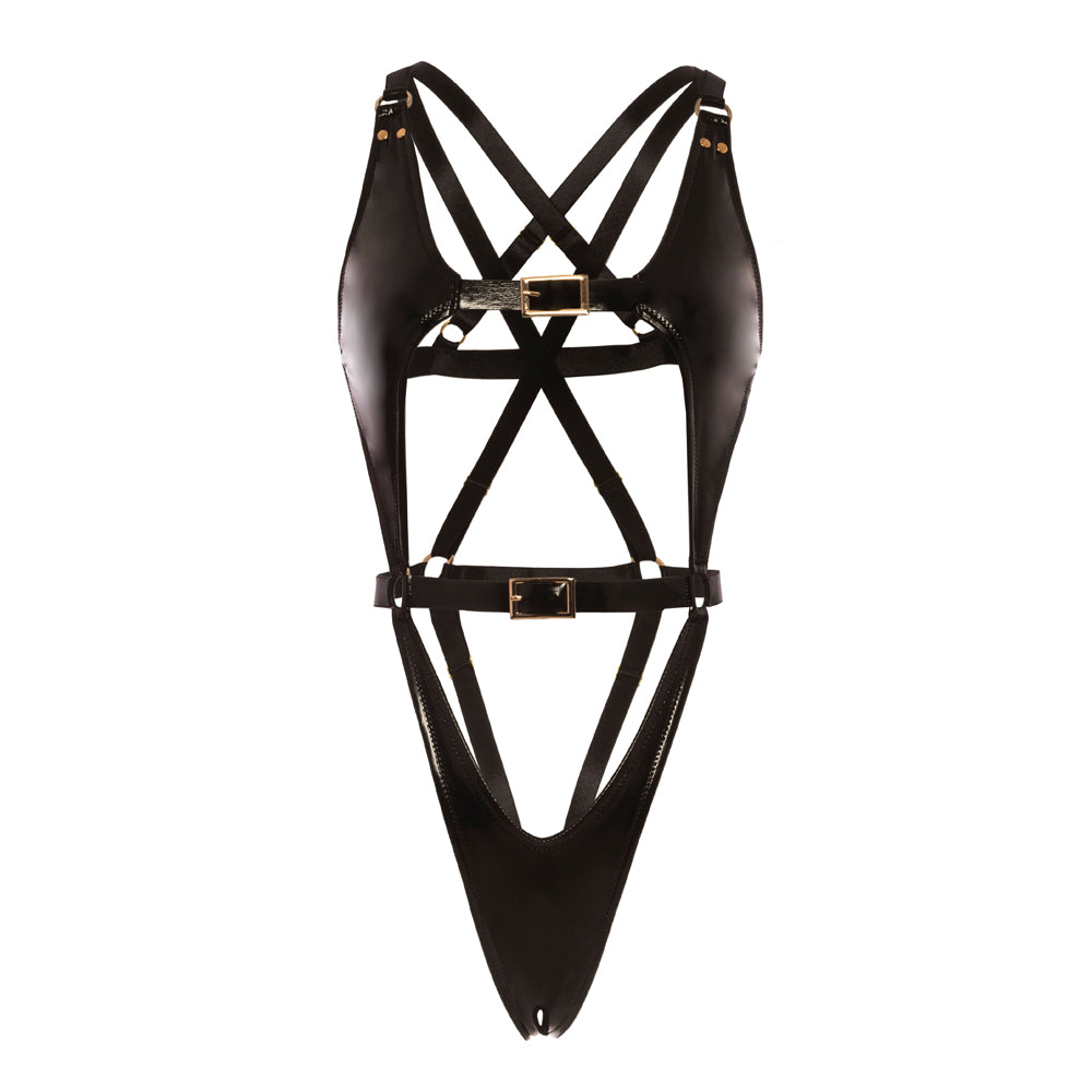 This BDSM-inspired one-piece comes from Oh La La Cheri's Fetish collection and is made from high-shine wet look material in an ultra-revealing design that puts all your goodies on display to captivate your audience, whether it's one lucky lover or a crowd at your next private kink event. A generous cutout down the torso reveals a tasty amount of underboob and plunges down your navel in an elongating V-shaped design, framing your curves with a pair of adjustable vinyl buckles that you can cinch to fit your figure. The ultra-high-cut silhouette accentuates the curve of your waist and hips while also making your legs look extra long so you can strut your stuff with the confidence you deserve!