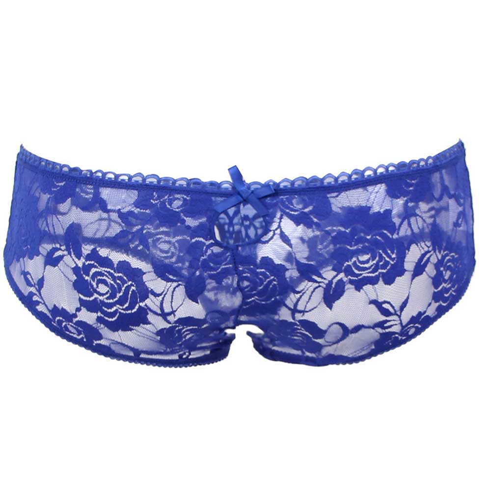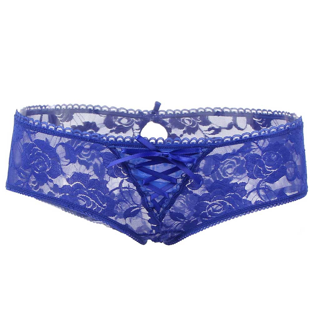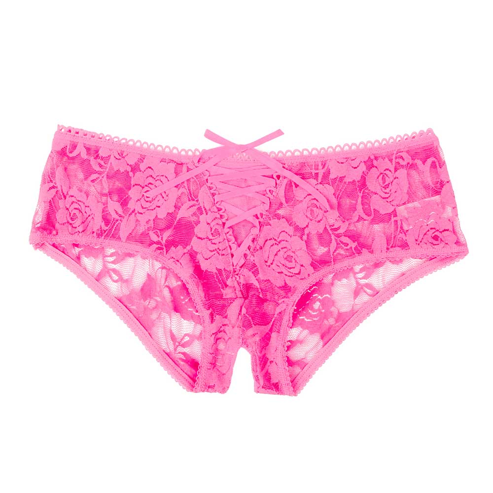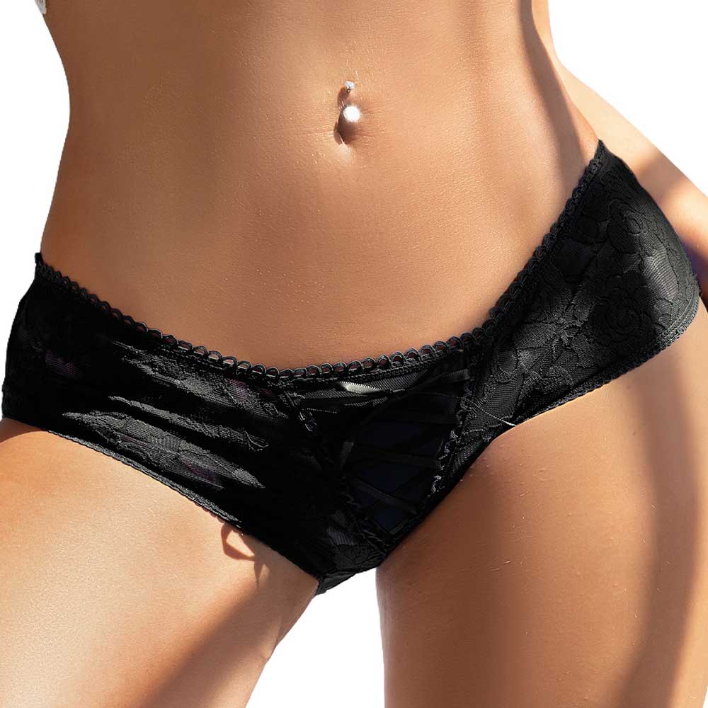 These bikini-cut panties are made from see-through lace that patterns your skin with feminine florals for a playful peekaboo finish and features a crisscross lace-up front detail that's adjustable like a corset for your best fit. A cheeky crotchless opening provides quick and easy access to your intimate assets for you or a lover to enjoy between the sheets! The back is accented by a keyhole cutout just under the waistband, adorned by a sweet bow to put a dainty finishing touch on your look.