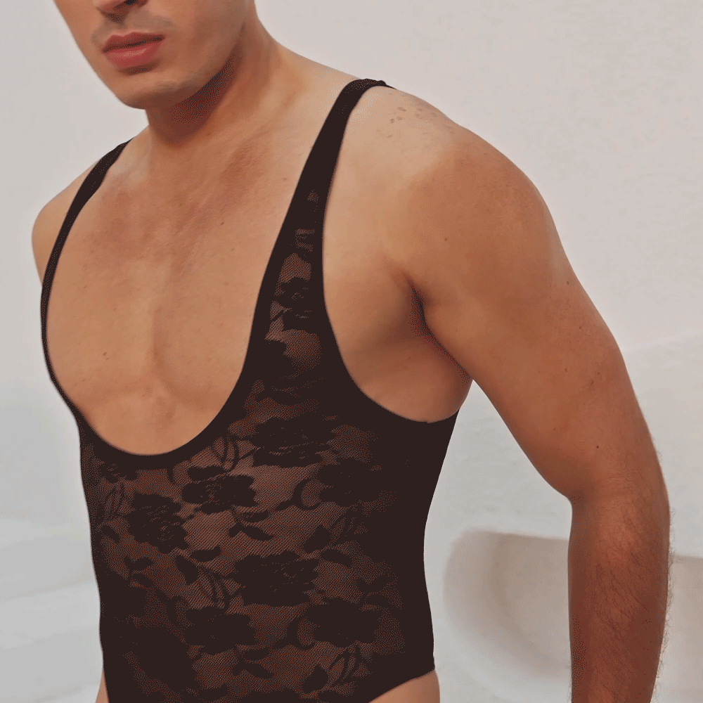 Show off your body all over in the Men's Sheer Floral Lace Thong Leotard from Oh Yeah!