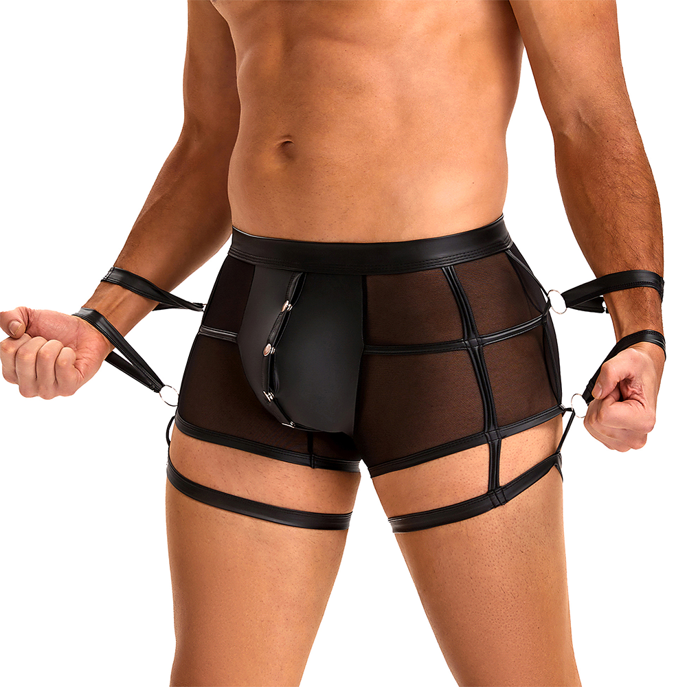 These boxers are a stylish wet look material with sexy sheer mesh sides and a playful twist—attached to the sides of these shorts are two loops for your wrists and forearms to slip through that will keep your arms close to your sides and restrict your movement for some light bondage action!
