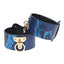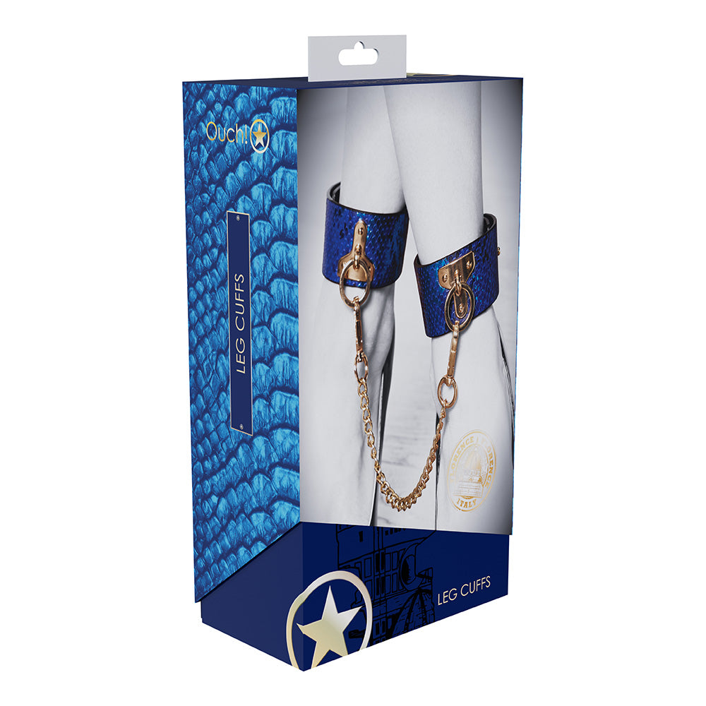 These ankle cuffs are made from vegan-friendly faux leather with a glimmering snakeskin pattern that shines against your skin in an iridescent shade of royal blue. Gleaming gold metal chain hardware holds the wearer securely in place and adds a touch of extra sophistication to the overall look. The cuffs' O-rings are bolted through the cuffs with sturdy T-plates, and the chain attaches to the O-rings via dual snap hooks for easy on and off for quick and easy play, or compatibility with other BDSM accessories (sold separately) for versatile fun!