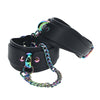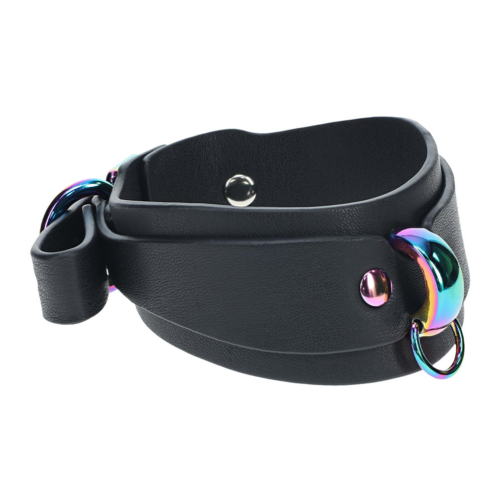 Made from vegan-friendly black faux leather with a sophisticated grain design, these handcuffs feature a shiny burnished rainbow metal that securely and comfortably restrains the captive. The eye-catching iridescent chain connects to sturdy D-rings, which are attached to thick neochrome plates for a sturdy yet stylish finish that's inescapable for superior restraint play! No sub will be able to get away in these babies...