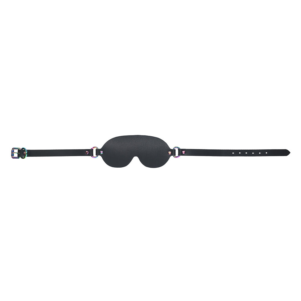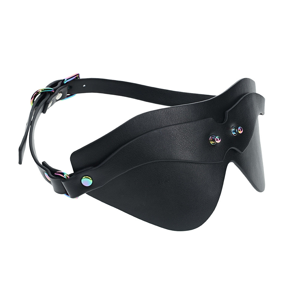 This sensory deprivation blindfold is the perfect accessory to heighten sensations in the bedroom, from foreplay and sex to sensation play toys like feather ticklers, drip candles, and more (all sold separately). The thick, faux leather is fully opaque and carved into a large, triangular design that completely covers the wearer's eyes while the contoured nose slot ensures a flush fit on their face for a total vision blackout! The burnished rainbow metal hardware contrasts beautifully with the black grain-effect design and is double-layered for extra visual interest in the front. In the rear, the adjustable buckle ensures a perfect fit on everyone while the vegan-friendly faux leather material ensures all kinksters can enjoy wearing or observing this eye mask!