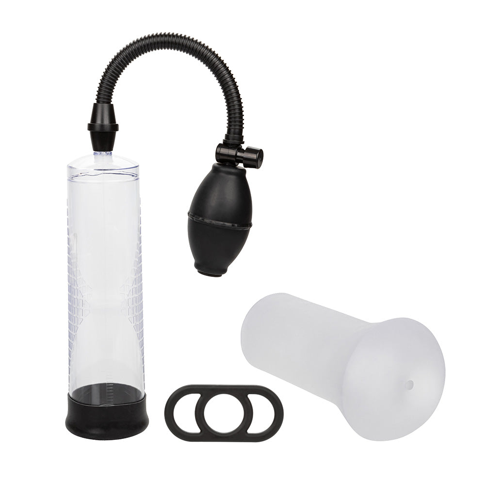 The kit includes a pump, a cock ring with side handles, and a stroker sleeve, all of which you can use together or independently for a versatile and comprehensive path to heightened satisfaction. The pump's design includes an easy-squeeze bulb and a flexible, non-crimping air hose with a quick-release valve, ensuring ease of use and optimal control in any position. The clear cylinder shows you your growth in real-time thanks to the measurement markings on the side and accommodates the included silicone donut, offering a snug and comfortable fit at the entrance of the pump.