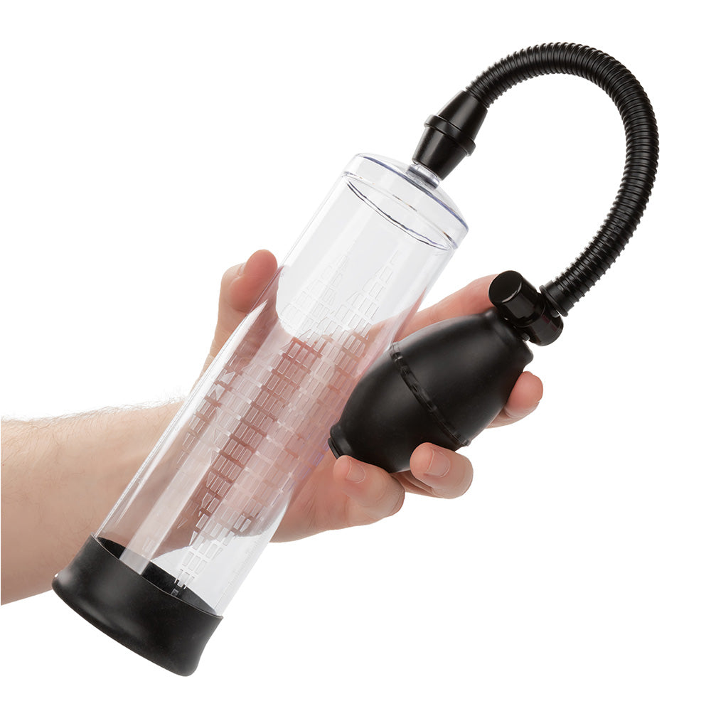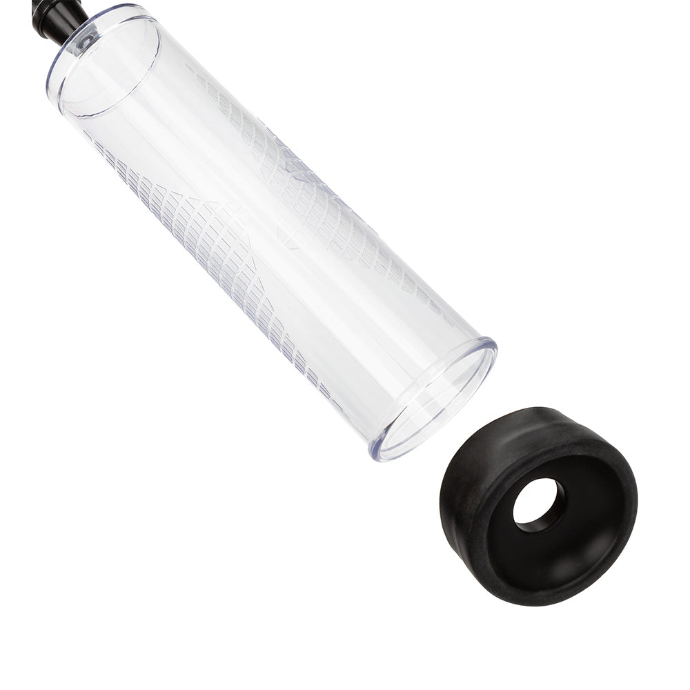 You can pump up the stimulation by adding the PureSkin® frosted stroker inside the cylinder, feeling the multi-textured chamber wrap around you for a variety of sensations while the pump works its magic. Complement the whole experience with the included Alpha Command Cock Ring, which has handles on the side so you can easily slide it from the pump cylinder on your erection to maintain your results! Afterwards, the entire pump disassembles easily for convenient cleaning.