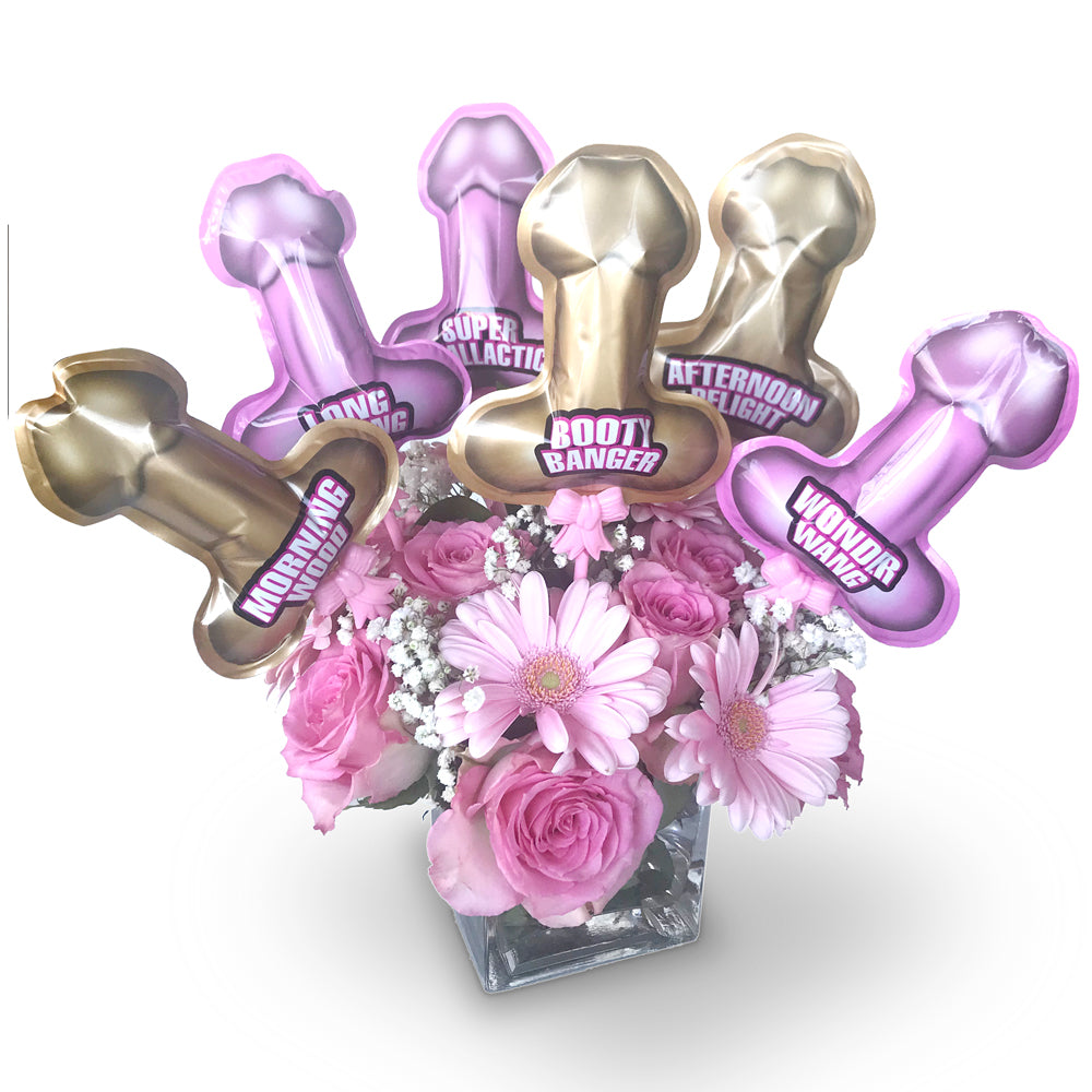 These funny mini balloons are shaped like penises to help bring the festive vibe to your hens' party, girls' night, or other 18+ events and are self-inflating for quick setup. Just whack the mylar balloons to break the packet inside and these balloons will plump up on their own, turning into shiny pink and tan brown peckers that stay inflated for over 2 months! Cheeky phrases like 'afternoon delight' and 'morning wood' are printed heads-up on one side and heads-down on the other so you can choose how to display them. Use them with the included bouquet sticks to fluff out some flowers or make a table centrepiece — you can also string them together to make a garland, use them as gift toppers, or hand them out as a party favour after your adult event!