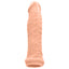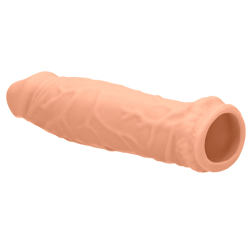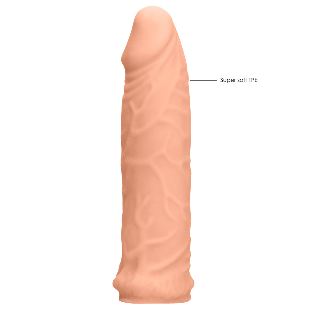 This natural-feeling penis sleeve is a hollow shaft that fits comfortably over your erection and has a squishy but firm head that adds 3 extra centimetres of usable length to your erection. The ridged head is sculpted to look and feel just like the real deal, with bulging veins all over the shaft for extra stimulation with every thrust! The sleeve is made from skin-like TPE for that ultra-realistic feeling you're both craving and is expertly sculpted to have a lifelike look. Once your fun is done, just rinse the waterproof material with warm water and toy cleaner to get your extension sleeve ready the next time the mood strikes!