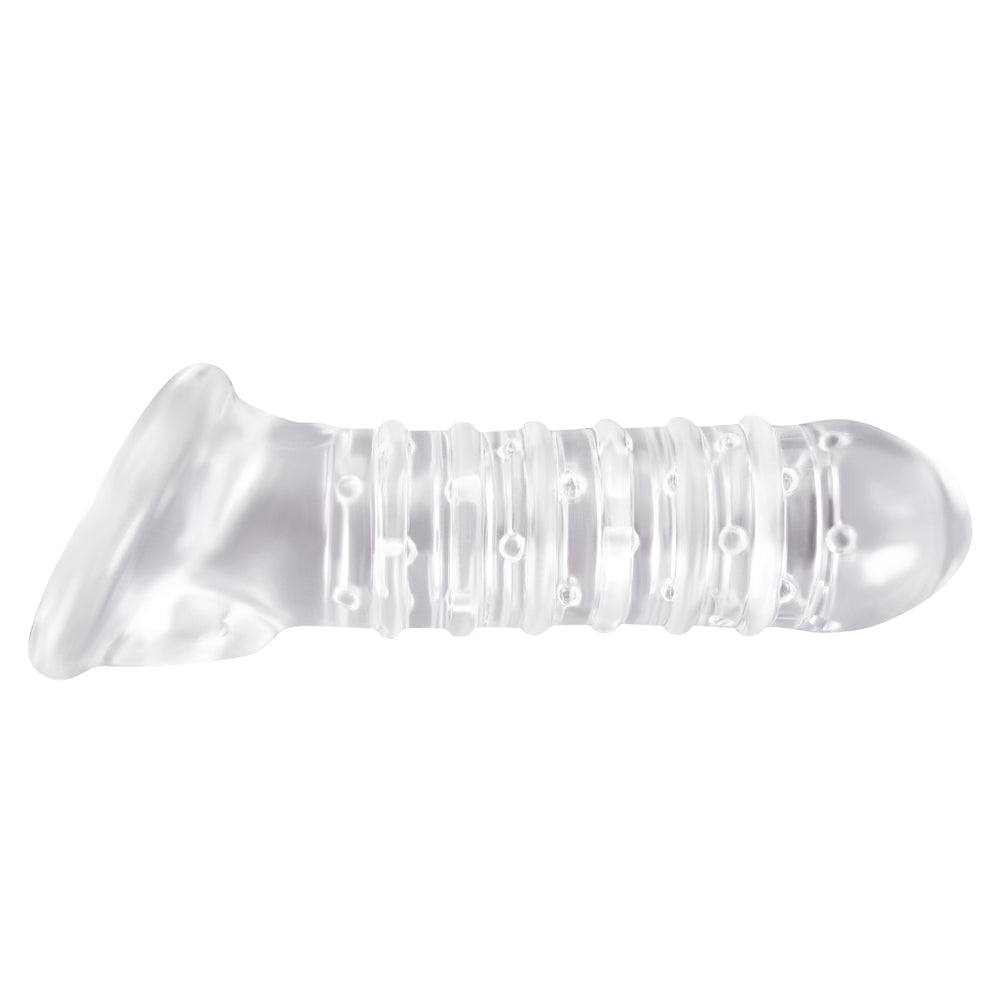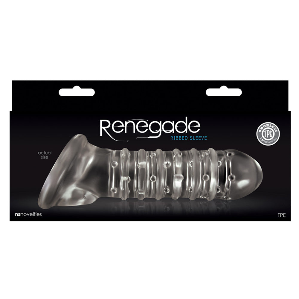 The Renegade Ribbed Penis Sleeve is made from clear, stretchy TPE that fits snugly over most men's sizes and lets you see all the action happening inside. The ball-drop section wraps comfortably around your testicles and secures the sleeve in place so it doesn't budge, no matter how wild the ride gets!