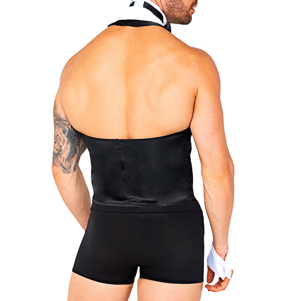 • Includes a tuxedo-style vest, shorts, wrist cuffs & shirt collar with bowtie
