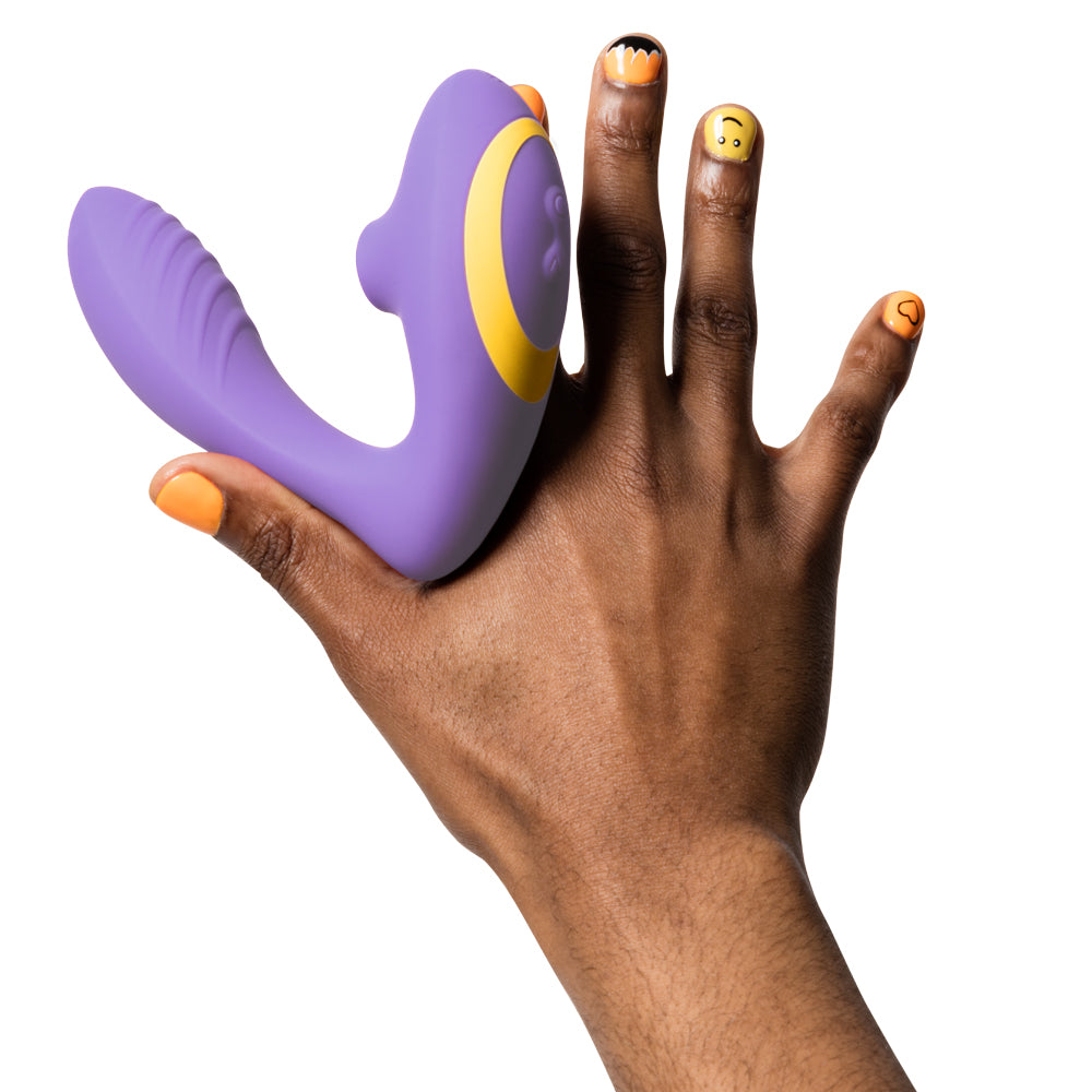 This dual-stimulation adult toy is blessed with a bulbous vibrating G-spot shaft and a clitoral suction chamber with thrilling Pleasure Air Technology™ to satisfy you inside and out. There are 2 intuitive control buttons so you can adjust your whisper-quiet settings with ease and enjoy them together or separately. There are 10 modes of contactless clitoral suction deliver rippling waves of air pressure changes to bring you to orgasm without overwhelming the sensitive tissue. Meanwhile, the insertable head nestles right up against your G-spot with its bulbous shape and ribbed texture that'll massage your inner walls just right as 10 vibration modes reverberate through you...