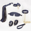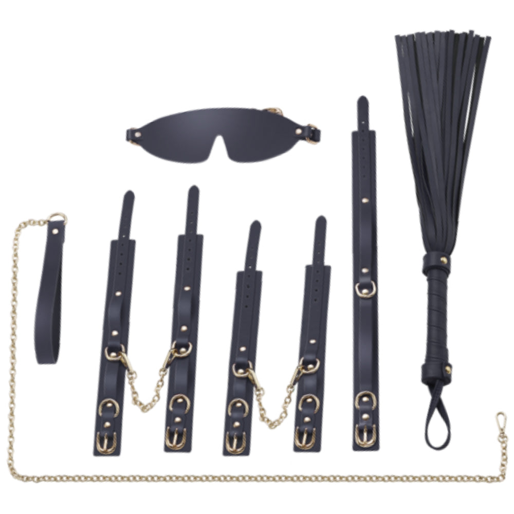 - Comes with a flogger, eye mask, leash + collar, wrist cuffs & ankle cuffs