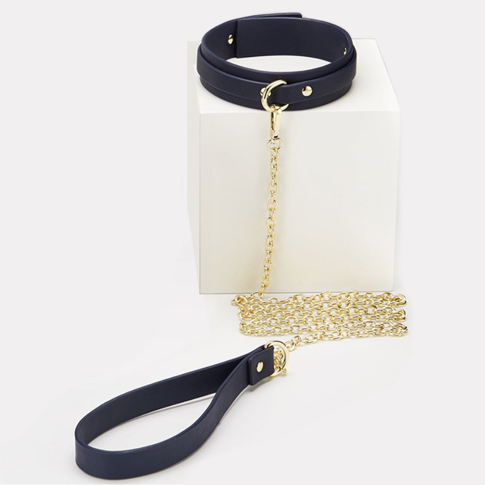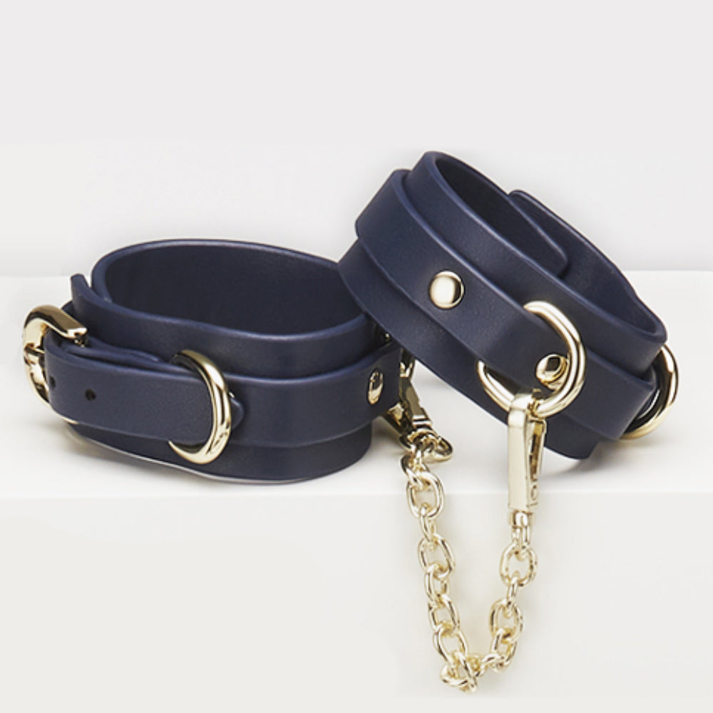 For an extra element of movement restriction, both sets of cuffs come with an optional metal chain to keep the wearer's hands and feet from spreading far enough to get into any trouble their Dominant doesn't approve of. Each restraint features sturdy D-rings for attaching these chains or the leash so Dominants can take delight in leading their sub around the bedroom or displaying them at fetish events like an obedient pet. Submissives will enjoy the way the smooth and supple leather feels against their skin, especially petite submissives as the restraints' slender design will not overwhelm their limbs or allow them to easily wriggle free. Finally, with its high-grade matte leather texture, sleek navy and black colouring, and sophisticated hand-polished gold hardware, you'll both love that this set is as attractive as it is restrictive.