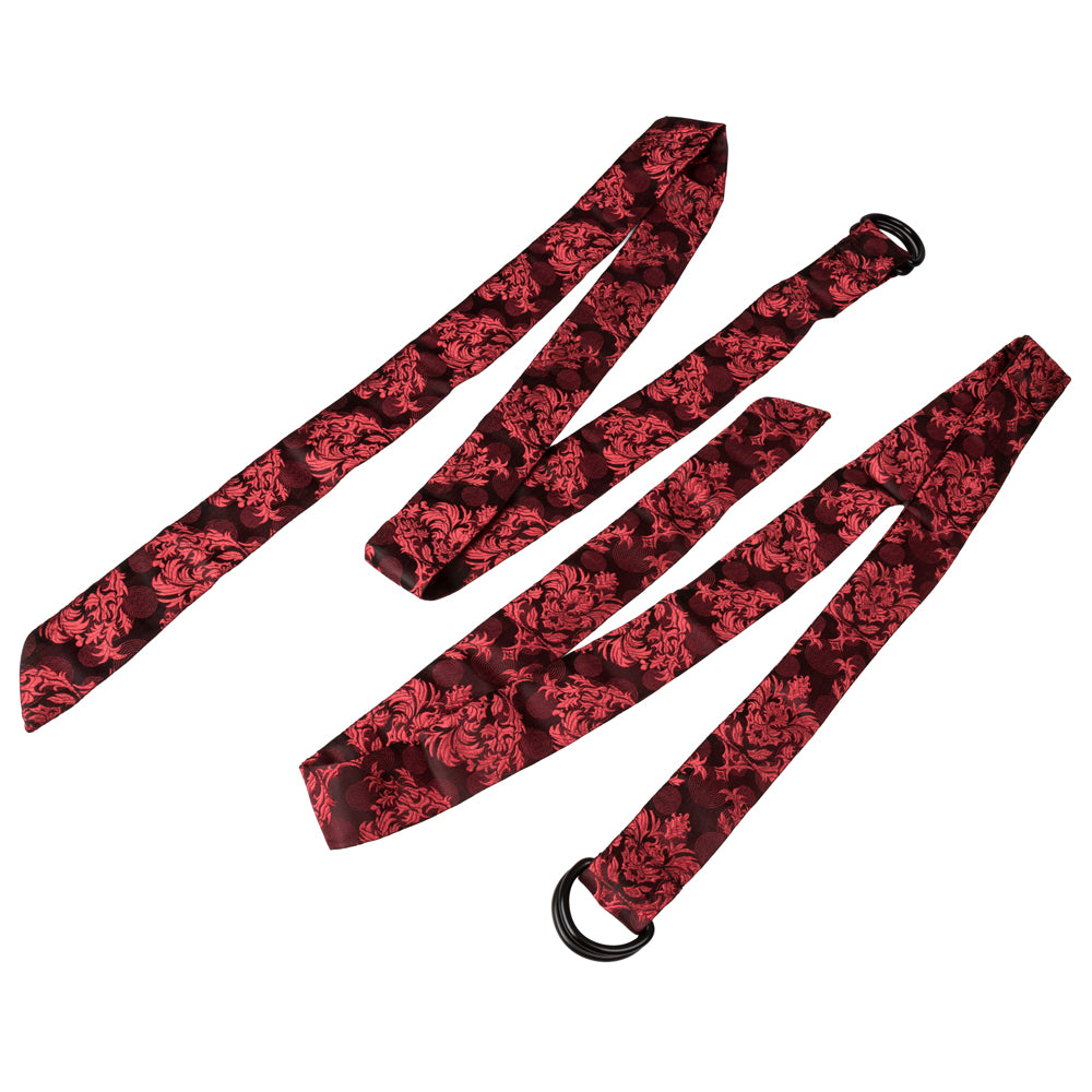 These sleek and sexy ties leave you bound and powerless, unable to resist your Dominant's desires and will. They are double padded to keep you comfortable while keeping you captive and feature a double-stitched construction for extra sturdiness you won't be breaking free from any time soon. The adjustable cinch design is easy to use and easy to release, all in a beautiful red and black brocade finish that's sure to complement any seductive setting...