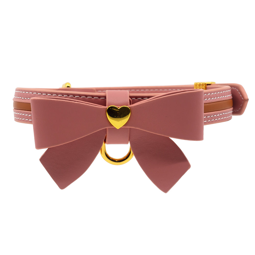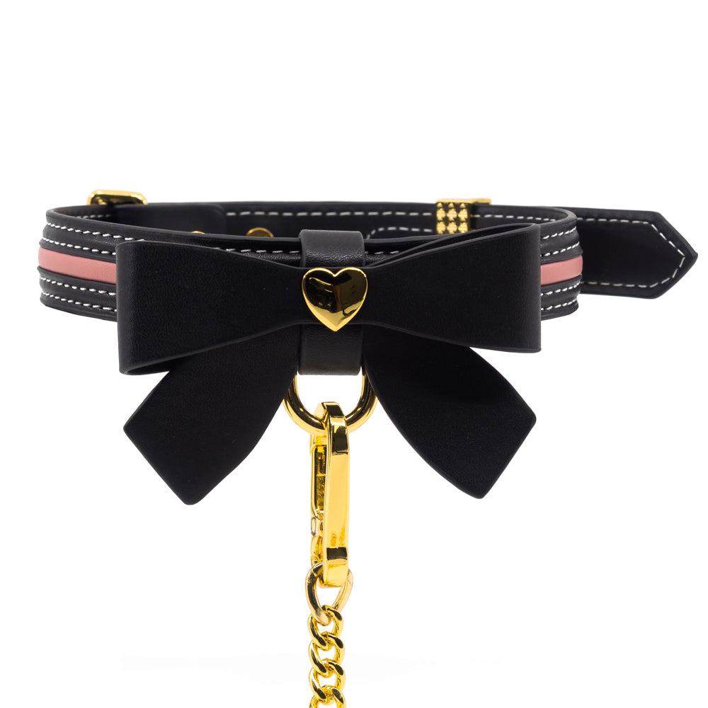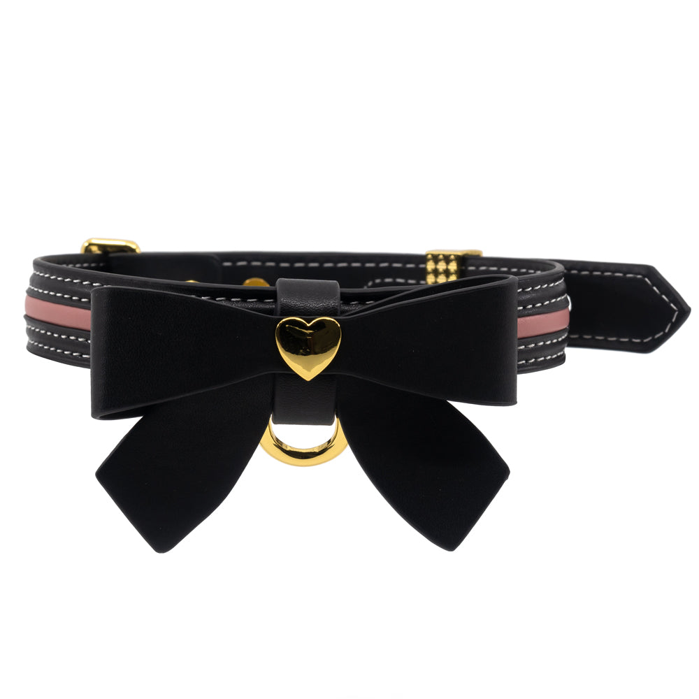 This vegan-friendly bowtie collar is the perfect BDSM accessory for wearing around the bedroom, at a fetish event, or even as a cute choker necklace while in public. The adorable bow is adorned by a yellow-gold heart at its centre, complementing the matching gold D-ring and adjustable keeper that tucks the collar tail in neatly. The charming bow detail is detachable for versatile wear with or without it, and there's also a padlock and keys included to give your Dominant total control over when you can remove your collar. Your Dominant can slip the lock in through the hollow push-stud closure before attaching the included leash to the collar's D-ring and parading you around like an obedient pet...