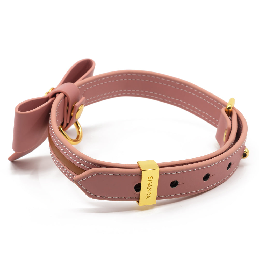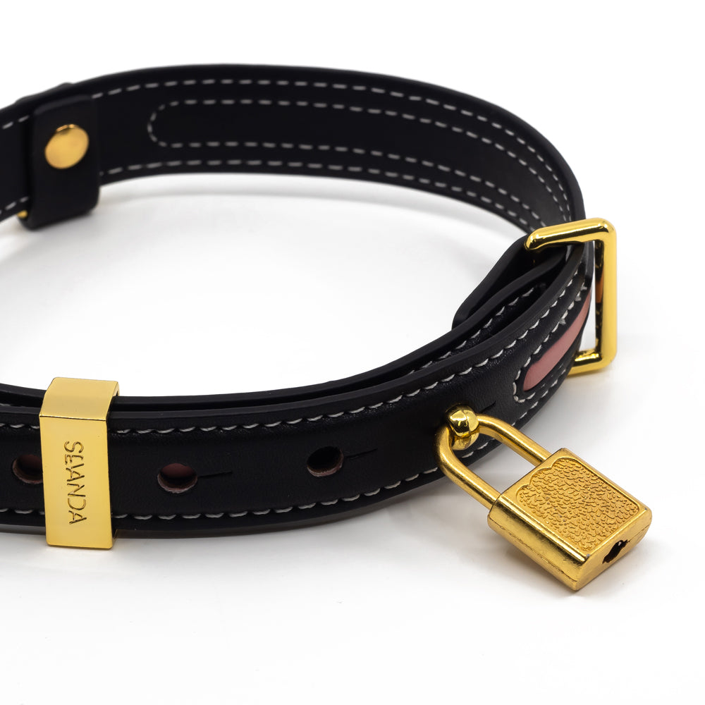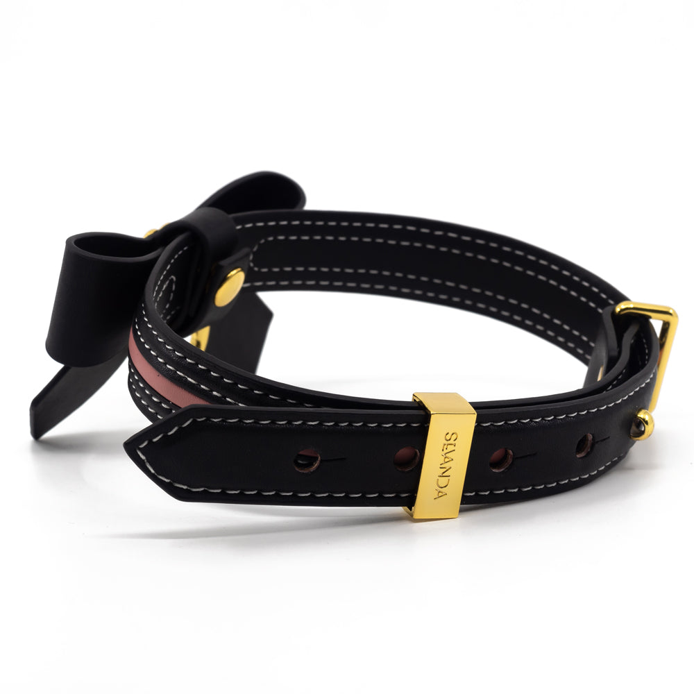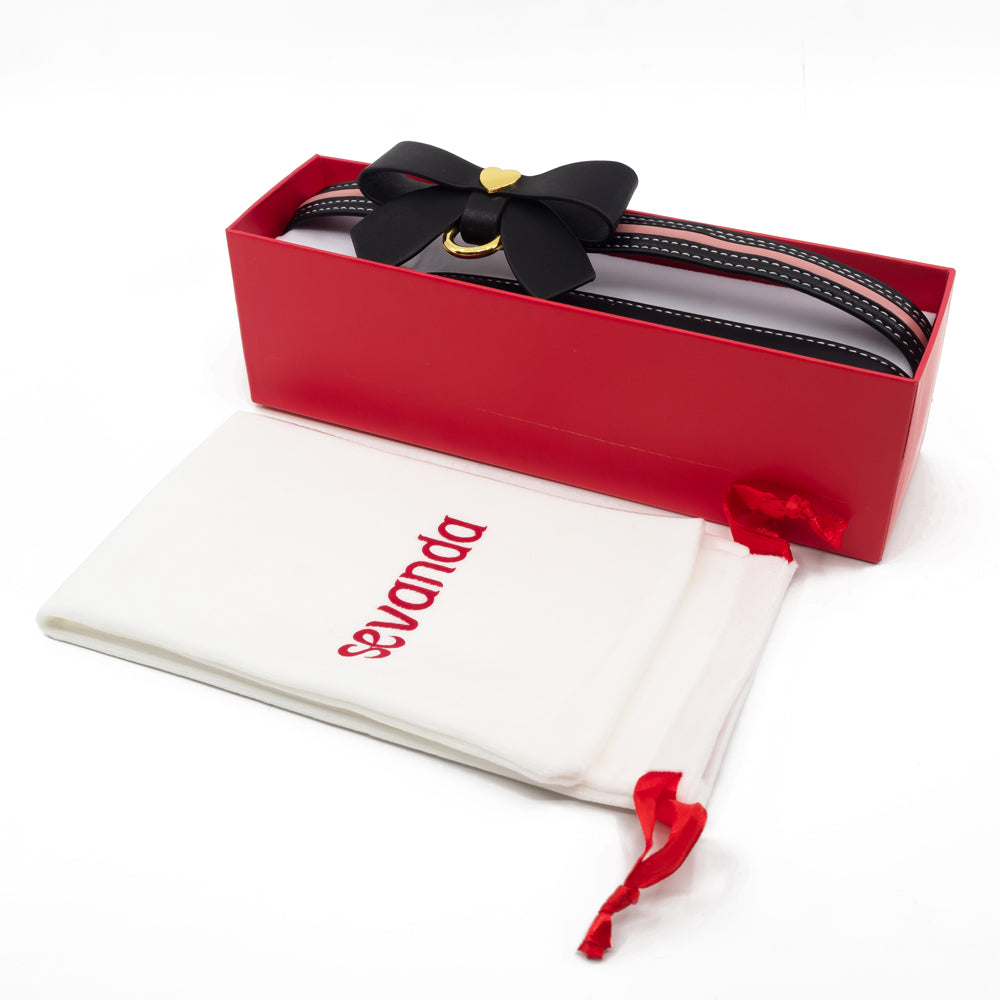 This vegan-friendly bowtie collar is the perfect BDSM accessory for wearing around the bedroom, at a fetish event, or even as a cute choker necklace while in public. The adorable bow is adorned by a yellow-gold heart at its centre, complementing the matching gold D-ring and adjustable keeper that tucks the collar tail in neatly. The charming bow detail is detachable for versatile wear with or without it, and there's also a padlock and keys included to give your Dominant total control over when you can remove your collar. Your Dominant can slip the lock in through the hollow push-stud closure before attaching the included leash to the collar's D-ring and parading you around like an obedient pet...