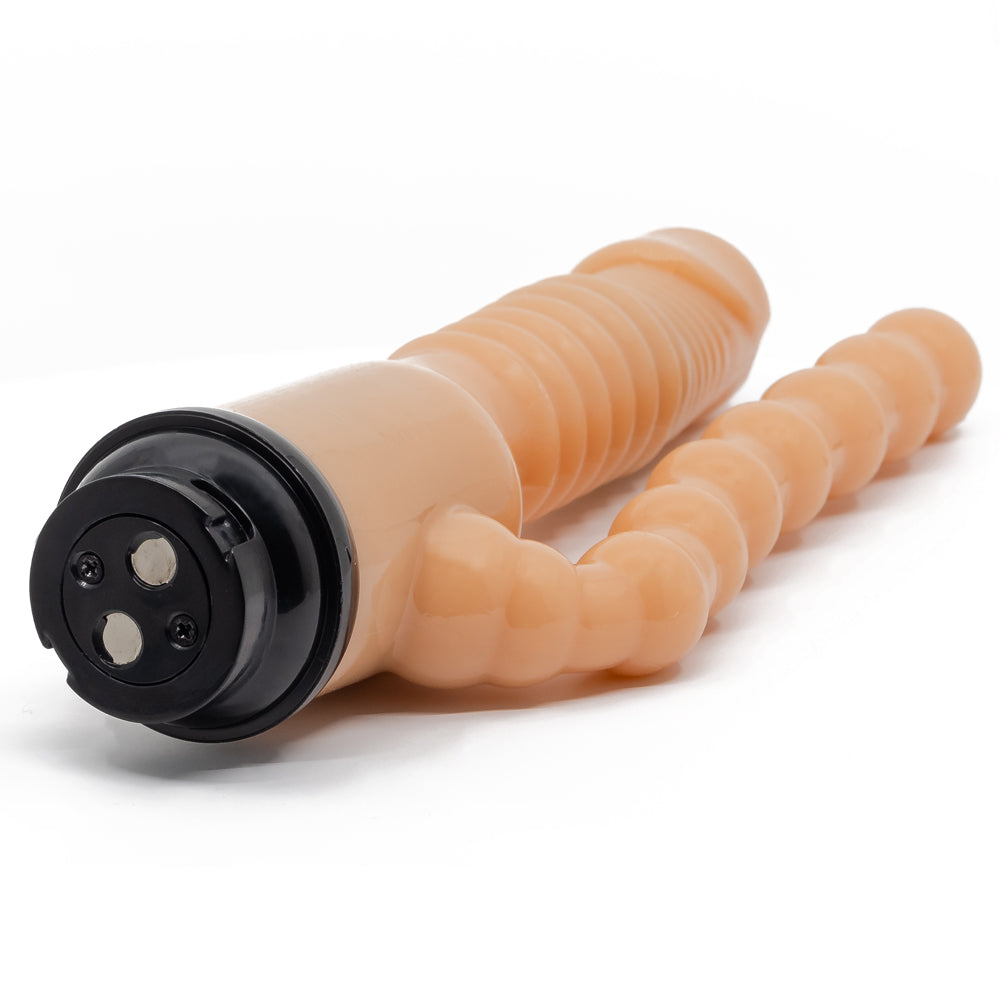 The Double Penetrator Handbag Sex Machine Attachment is flexible to let you easily adjust your position for the sensations you desire. The consistent anal bead size and tapered phallic tip are easy to insert with the help of some water-based lubricant while the beaded and ribbed shafts massage your inner walls like never before...