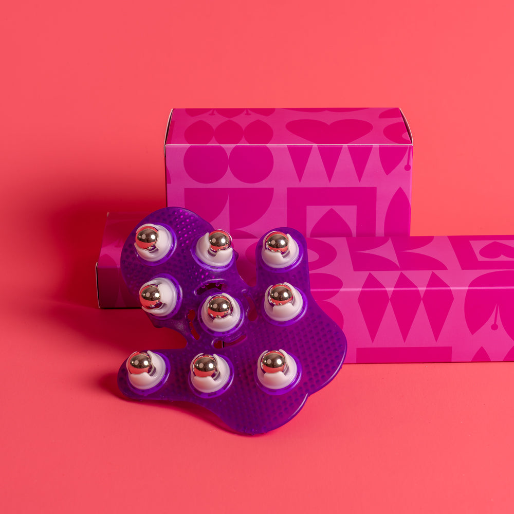 This universal-fit massage glove is equipped with 9 steel balls that offer 360° of smooth rolling action for simple stress relief and relaxation—just slip the palm-shaped device on via the back strap and glide it over your body, or a partner's!