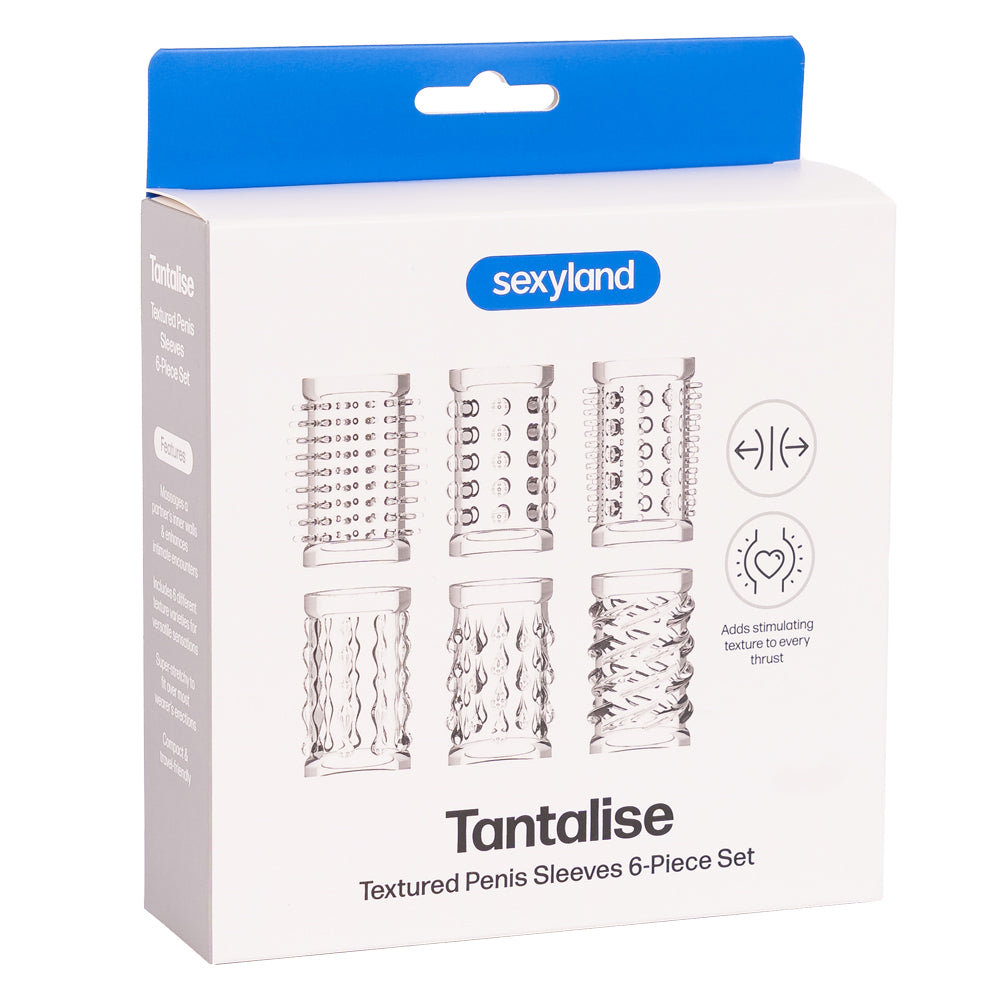 Add versatile stimulation to every thrust with the Tantalise 6-Piece Textured Penis Sleeves Set from Sexyland!