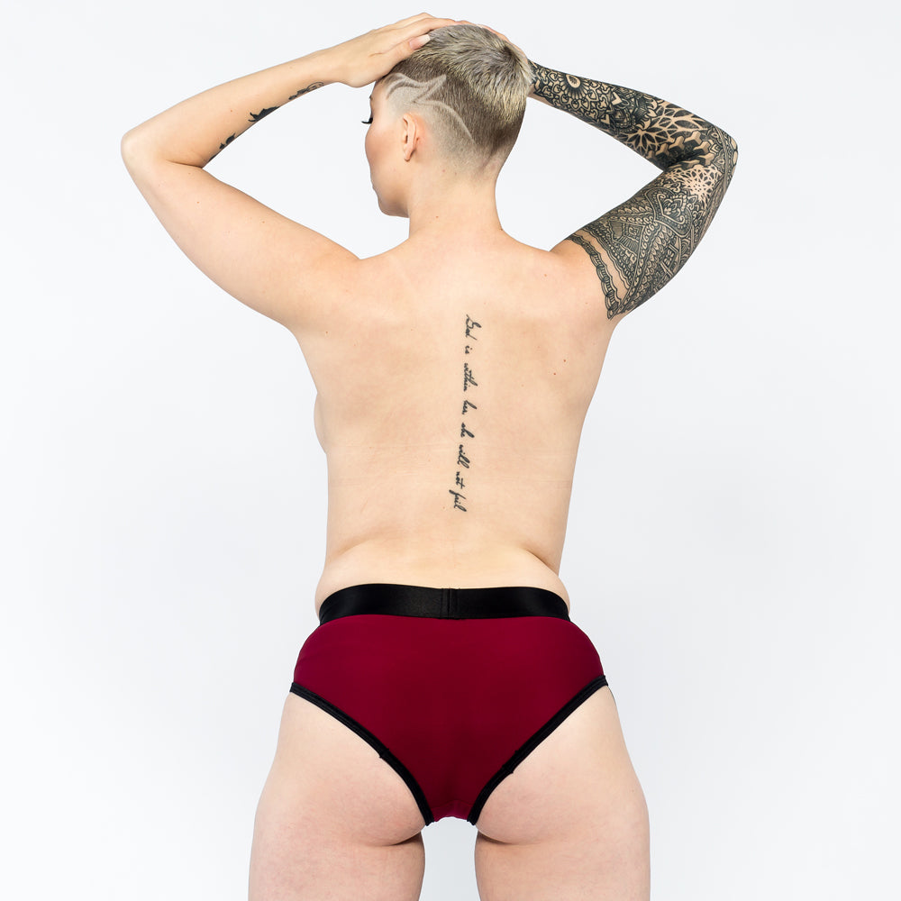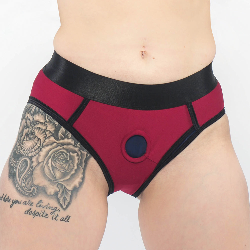 Forget about unwieldy straps and pinching buckles! This strap-on harness has been styled like a pair of high-cut jocks for the ultimate comfort, durability, and fit while showing off your cheeks. The wide elastic waistband and stretchy fabric feel oh-so-soft against your skin and also wick moisture away so you can stay cool and dry while you play. Your toys (sold separately) are sure to stay securely in place thanks to the dual-layered fabric that holds the flared base of your toy behind the built-in nitrile rubber O-ring. For even more fun, the Sportsheets Contour Harness also has 2 slot holders for bullet vibrators that stimulate your clitoris while you please your lover. It even comes with its own travel pouch so you can take your harness everywhere, though it's so comfortable you could totally wear it through your flight!