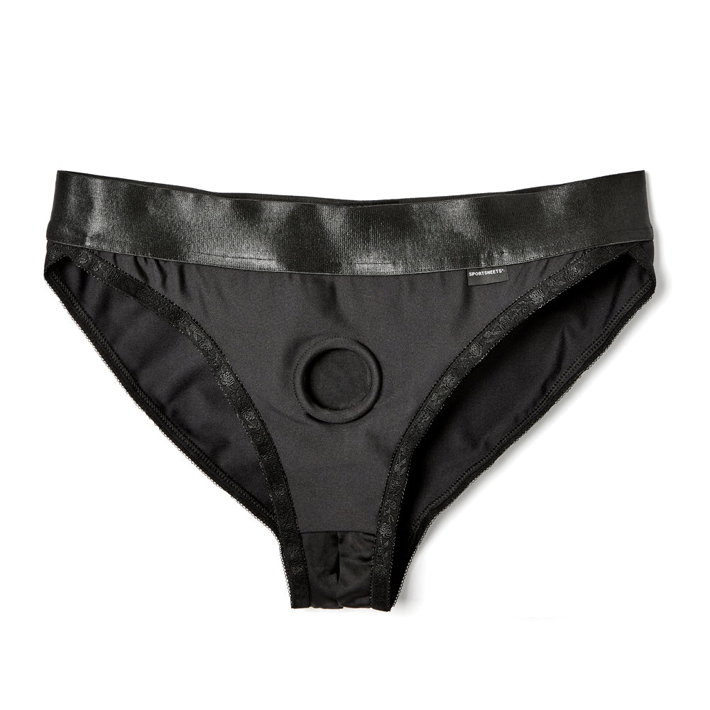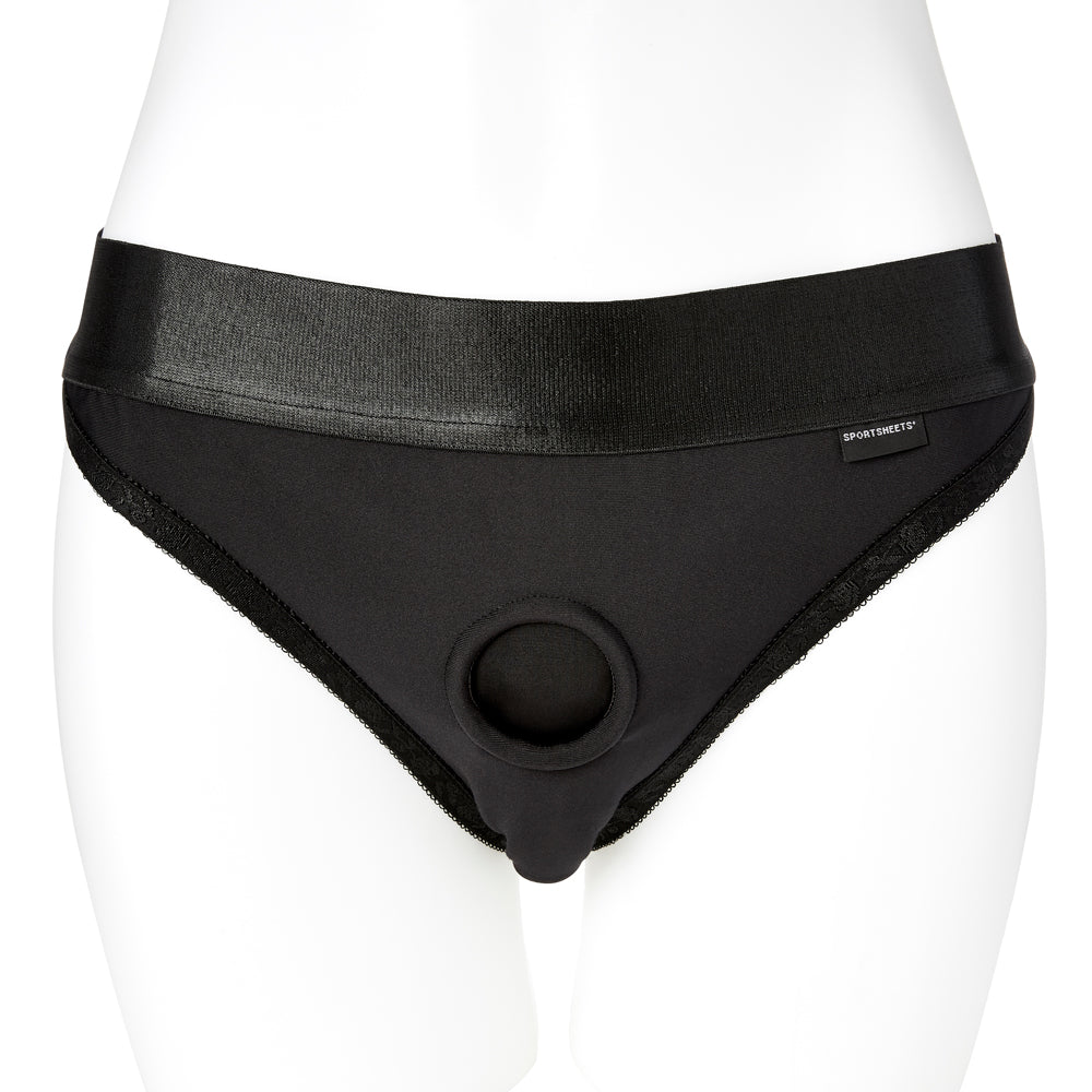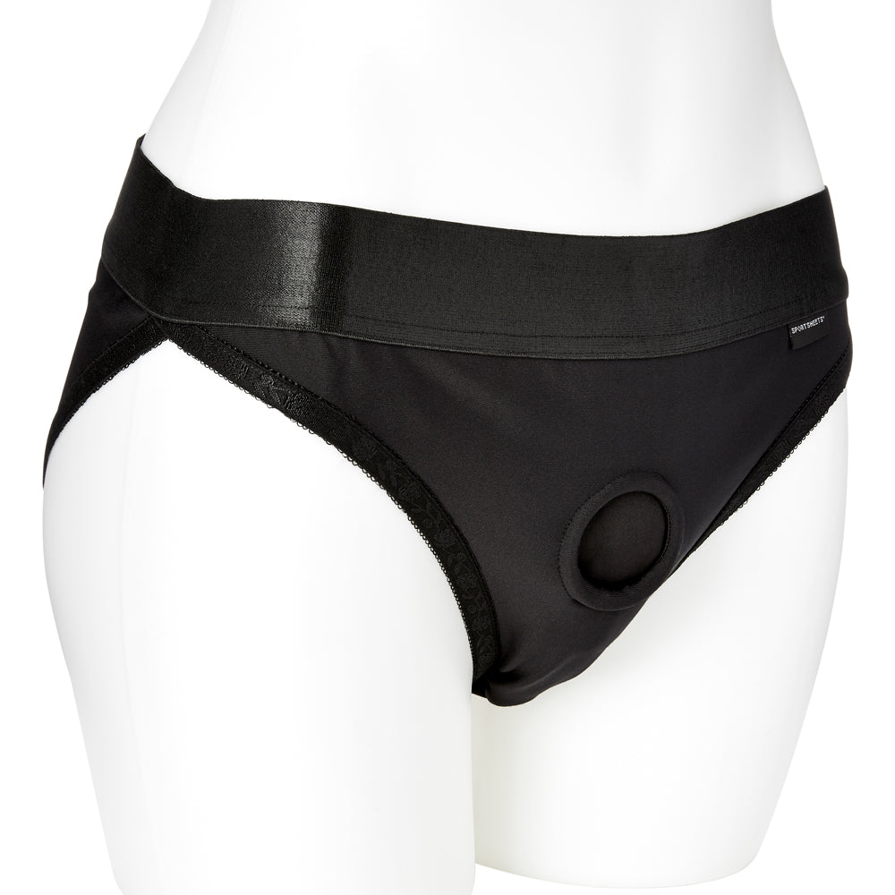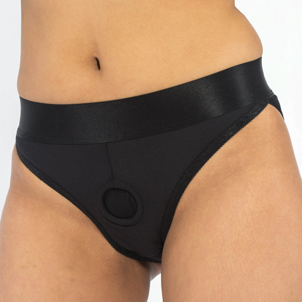 This crotchless strap-on harness resembles a pair of bikini-cut jocks to offer you the ultimate comfort, durability, and fit. It's made with a wide elastic waistband and soft, stretchy fabric that's moisture-wicking so you can stay cool and dry all day and while you play. It's also great at securely holding your toys (sold separately) thanks to the dual-layered fabric behind the built-in O-ring — just slot the flared base of your dildo behind both folds and it's sure to stay in place no matter how crazy the fun gets!