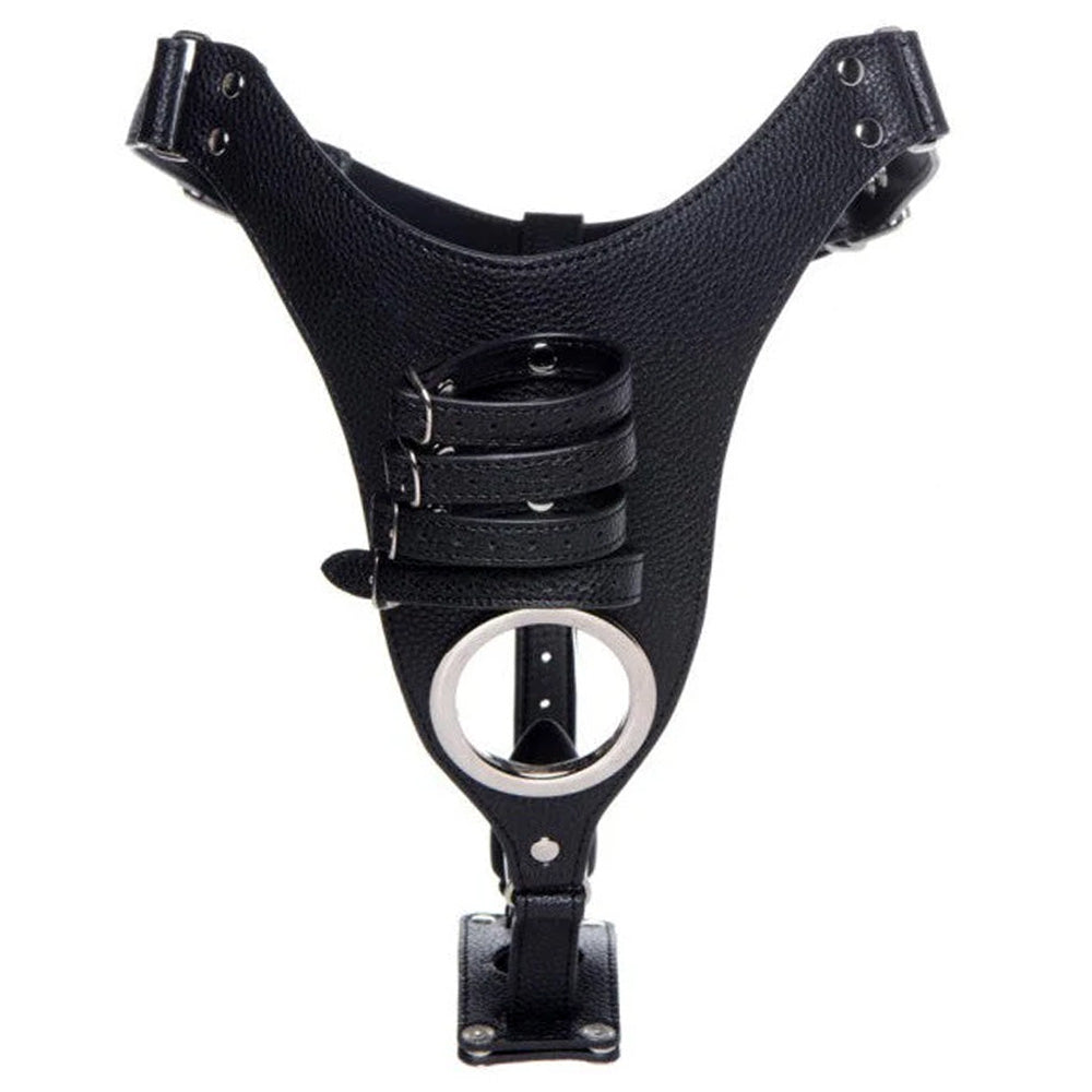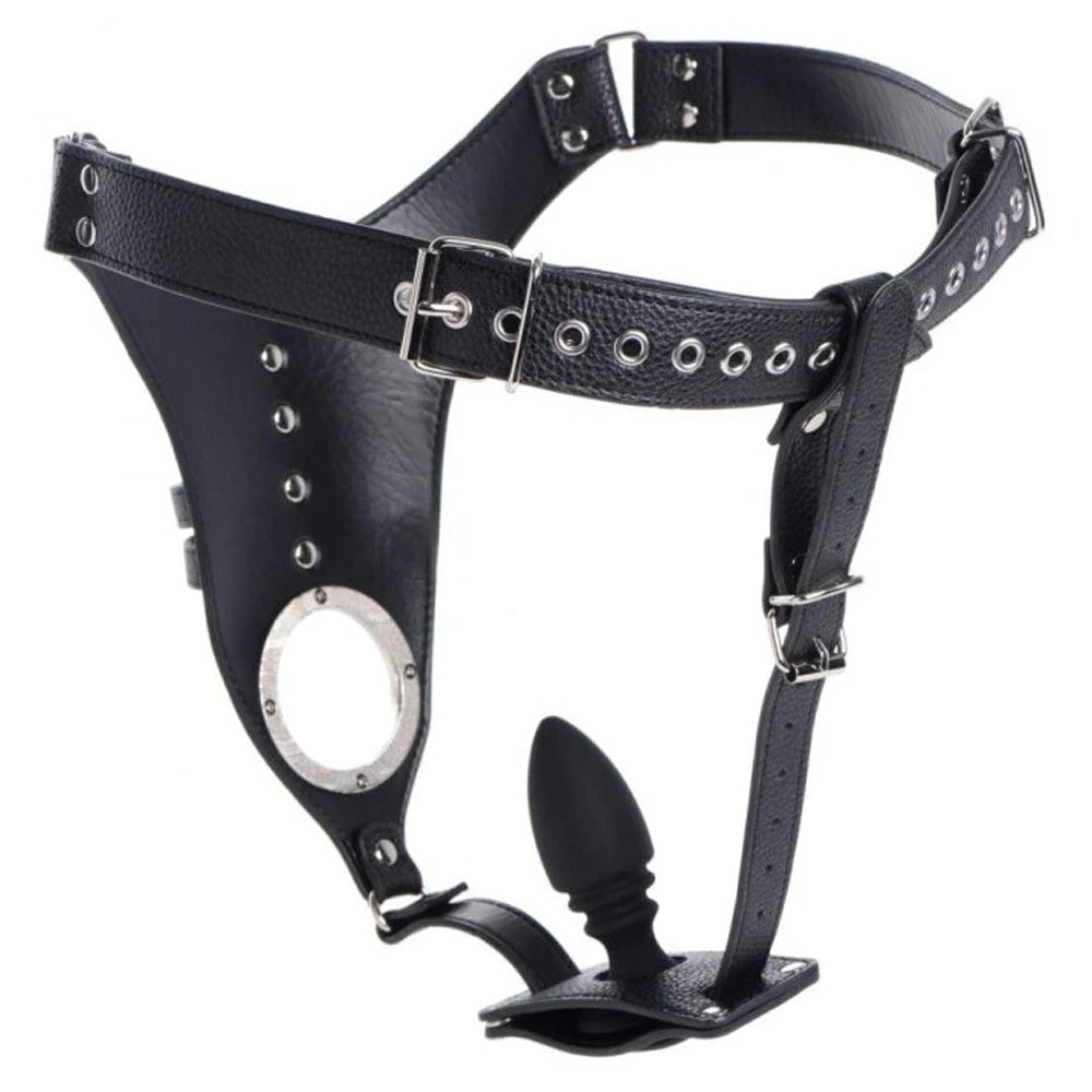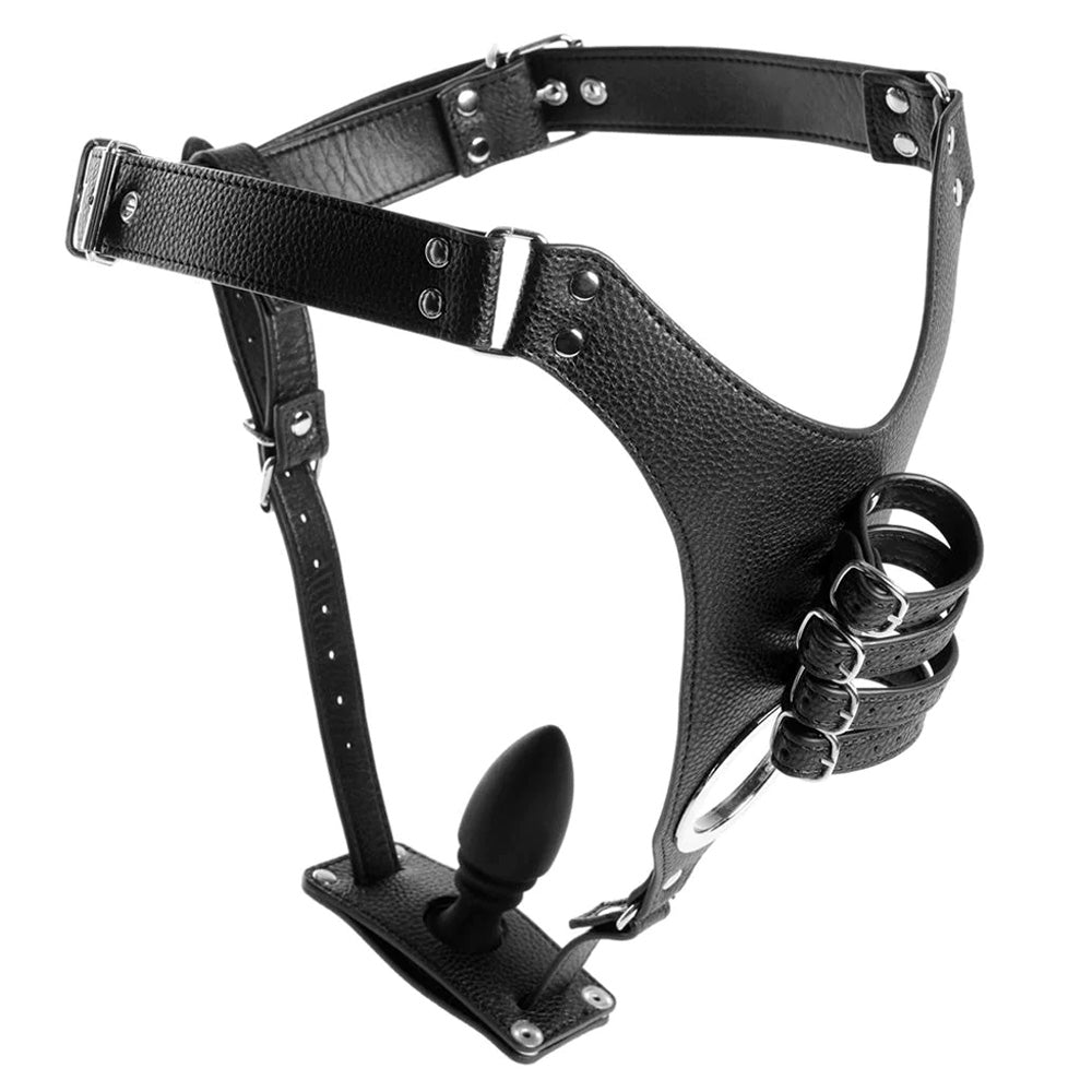 This adjustable chastity belt encircles the wearer's waist and wraps around their underside and between their rear cheeks to lock them into a position of total helplessness. This is made even more humiliating by the optional silicone anal plug, which slots into the optional holster and fills the wearer from behind while their shaft and testicles are trapped by 4 adjustable buckled straps and a metal ball ring! You'll love watching their erection strain hopelessly against the straps in its upright position as you make your plaything earn their freedom and toy with them during slave roleplay, forced chastity, and cuckolding scenes...