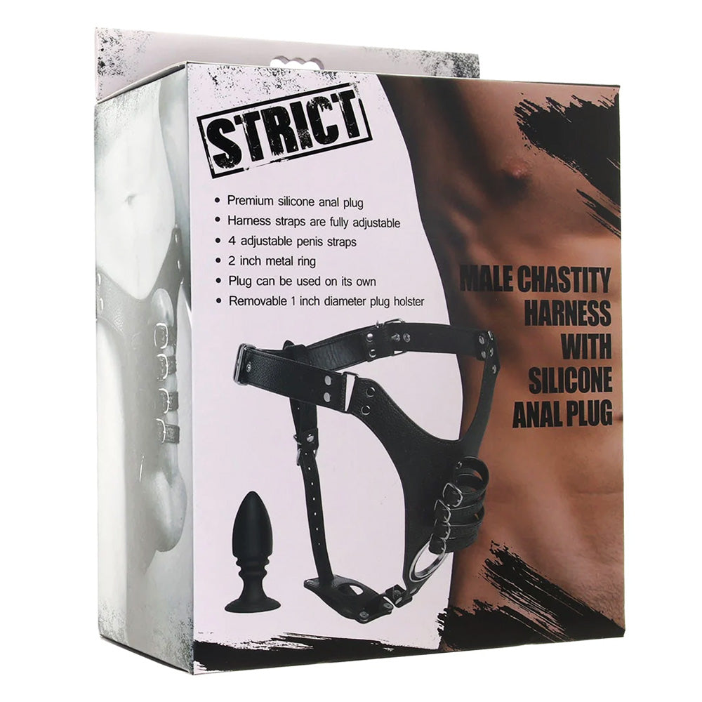 Put your boy toy in their place and keep them there thanks to the Strict™ Male Chastity Harness With Silicone Anal Plug!