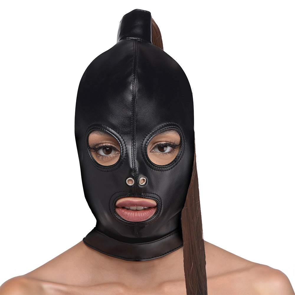 Key features of the Strict Open Eyes & Mouth Bondage Hood With Faux Ponytail: