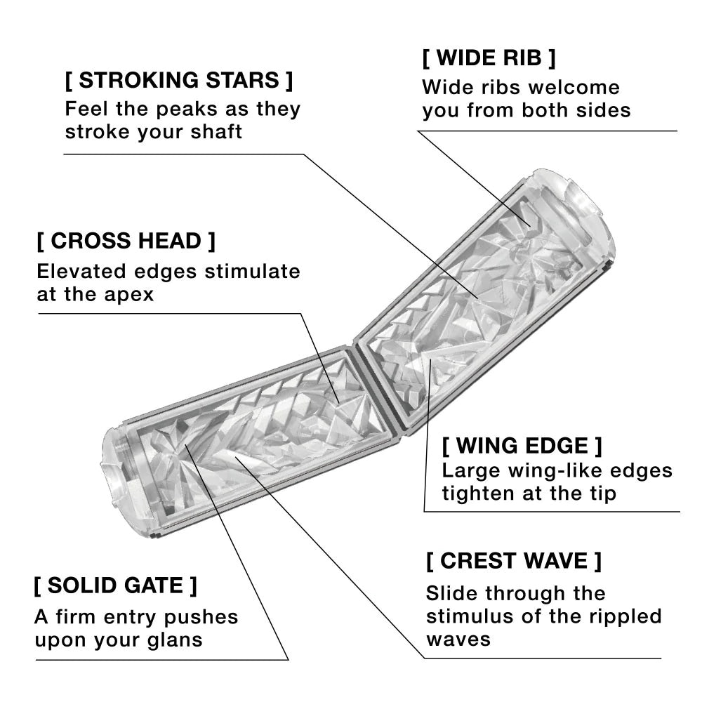 On one side, you start at the Solid Gate, which acts as a firm entry and pushes against the head of your penis upon insertion. You slide through the Crest Wave section full of rippled waves and end at the Cross Head section full of elevated edges to stimulate you at the deepest part of your stroke. On the other side, you'll be welcomed by the Wide Ribs on both sides, experience the peaks of the Stroking Stars rubbing your shaft, and finish at the Wing Edge that tightens at the tip to squeeze your head!