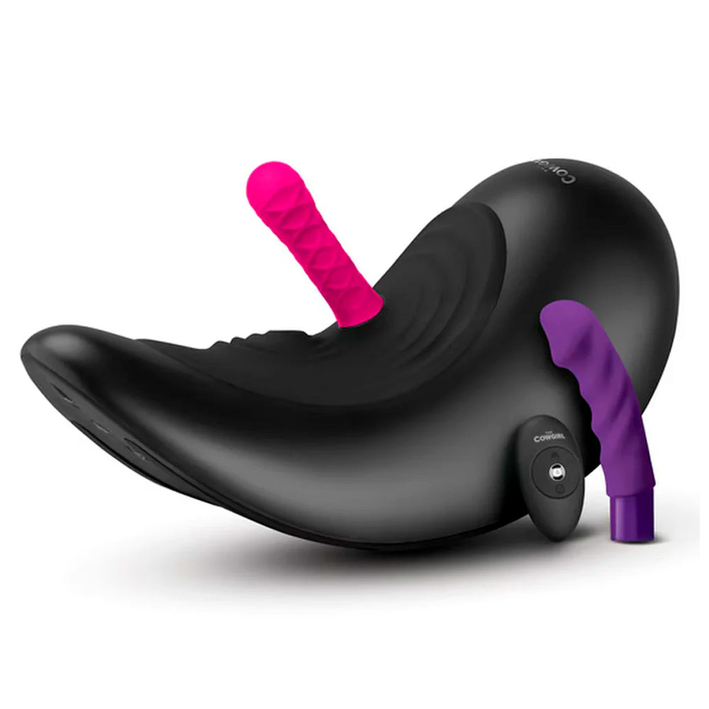The Cowgirl Saddle Sex Machine offers 3-in-1 stimulation through the ergonomic silicone seat to satisfy any rider with customisable sensations: vibration, clitoral tapping, and thrusting. It comes with 2 interchangeable silicone dildo attachments, which simply slide in or out via the magnetic docking slot for easy swaps. Both attachments are uniquely shaped to provide distinct sensations, inviting exploration and indulging creativity—the flexible ribbed attachment with the phallic tip vibrates in 5 fantastic functions, and the stiff, honeycomb-textured attachment thrusts in 5 thrilling modes! Adjust your settings via the onboard button under the narrow end of the Saddle, with the wireless remote, or you can hand the remote to a partner to take charge of your pleasure and keep your own hands on the machine for more control as you rock, ride, and thrust...