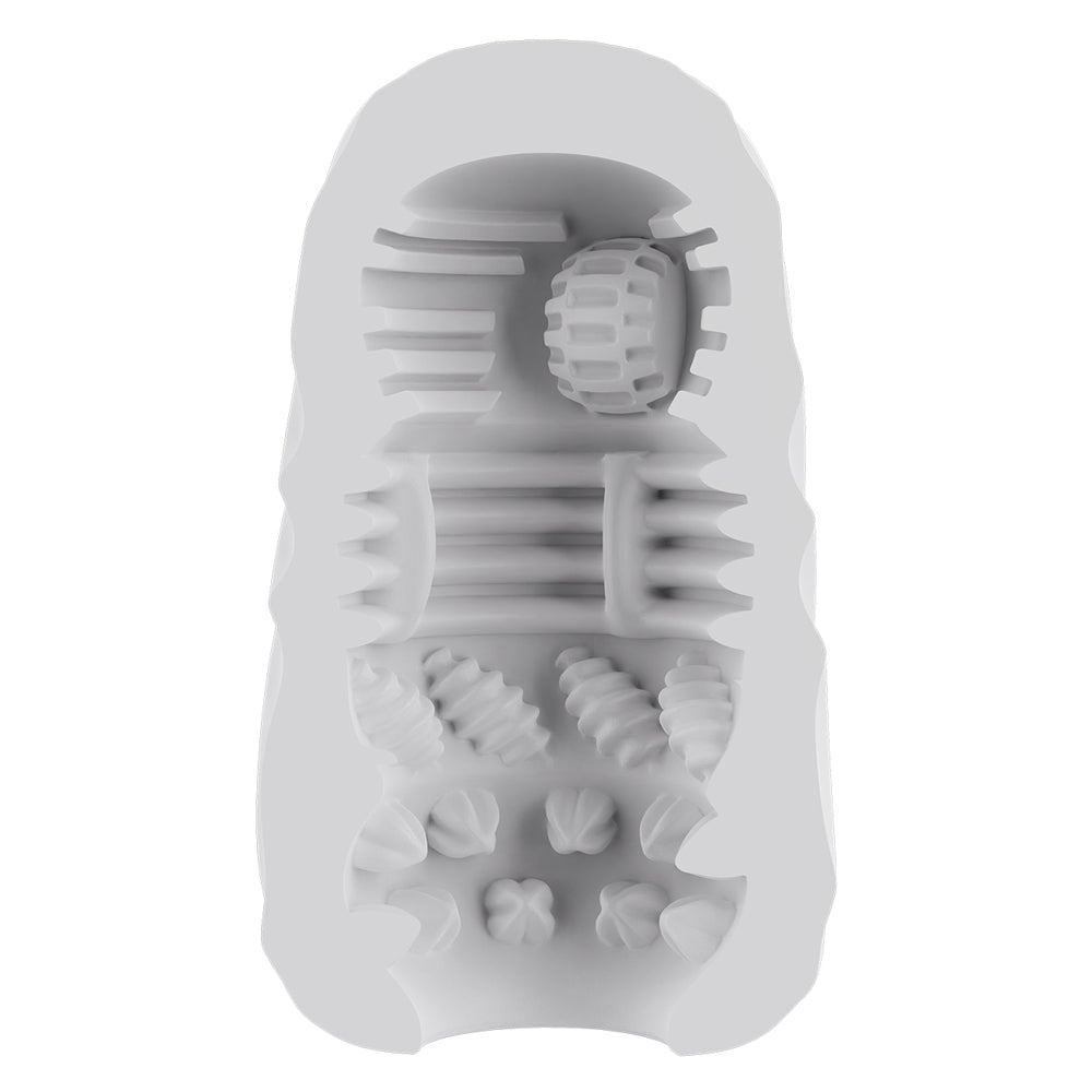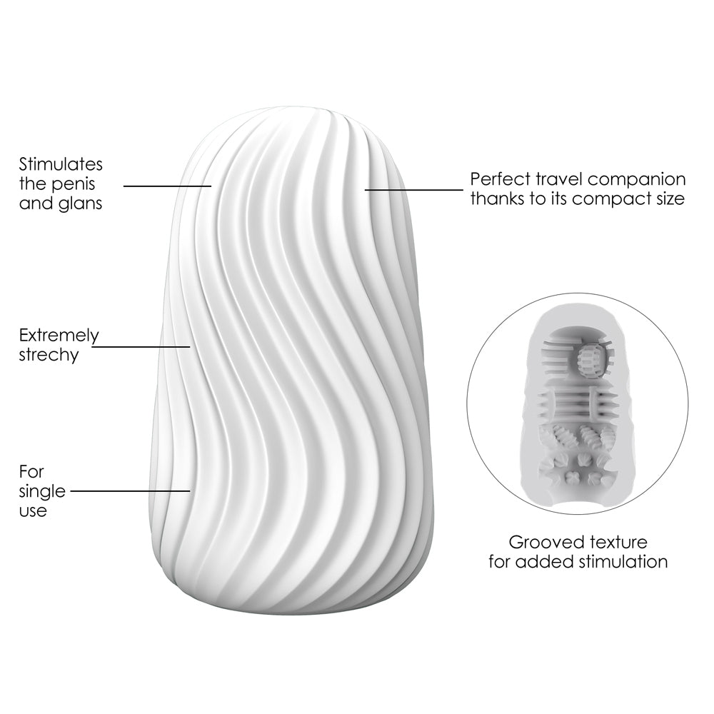 This soft and stretchy masturbator features a thrilling helix texture inside that glides over your head and shaft, stimulating you with a series of ribs and faceted pleasure nodes. The outside is textured with a simple wavy design to give you more traction and grip as you stroke the masturbator up and down your length. The stretchy material fits almost any user's size and shape, providing total coverage over your whole package as you stroke away to your heart's content!