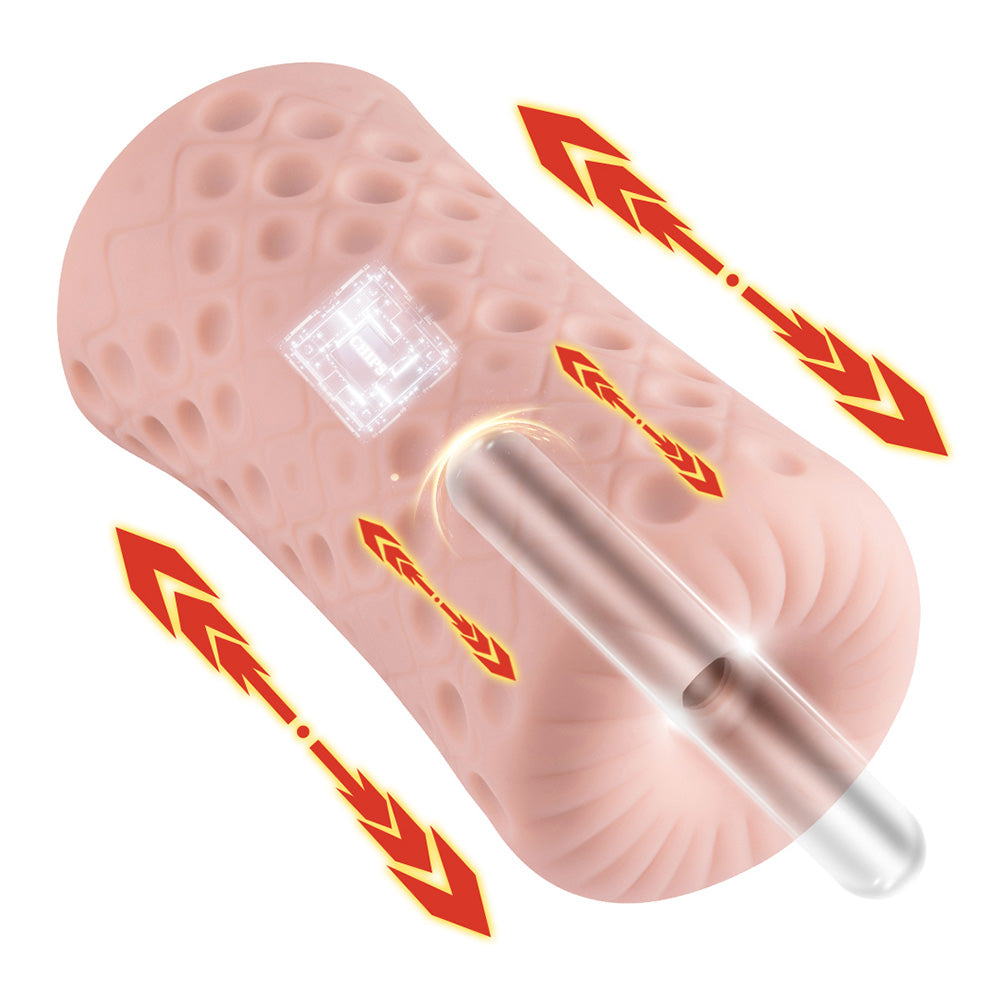 This auto-stroker has been designed to accommodate users with girthier erections and delivers 7 modes of thrusting that automatically stroke the sleeve up and down, focusing on the sensitive tip of your penis for maximum pleasure. Your thrusting settings include 3 speeds and 4 patterns, all at a whisper-quiet volume for discreet play, and are easy to activate, switch, or stop with just the push of a single button at the top of the toy!