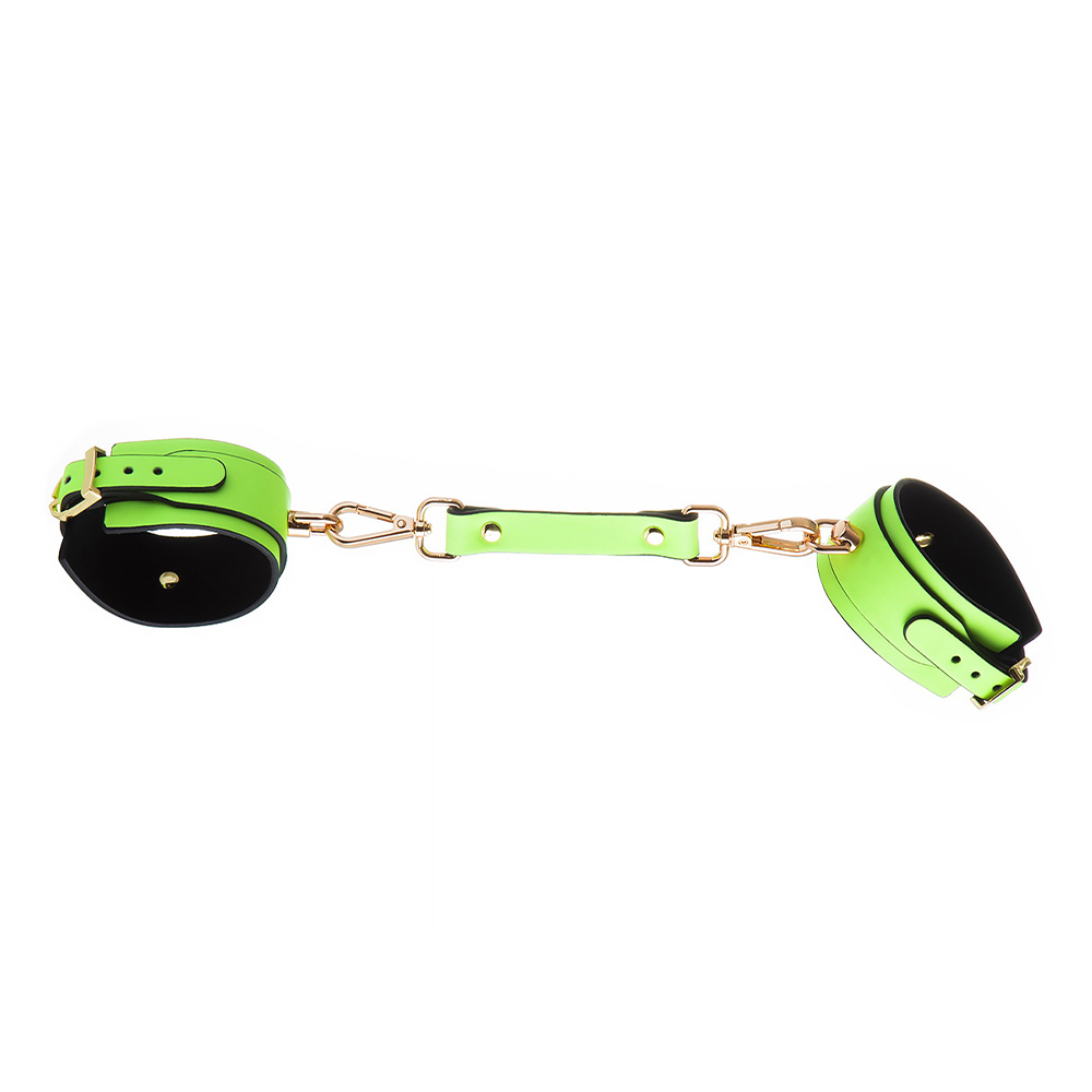 These vegan-friendly cuffs are perfect for getting frisky in the dark thanks to the luminescent faux leather with a glow-in-the-dark finish that adds a fun touch to bondage play, in person or on camera. Each cuff features sturdy, gleaming gold metal hardware, including adjustable buckles for a perfect fit and D-rings that easily clip onto the included connector strap via the dual snap hooks.