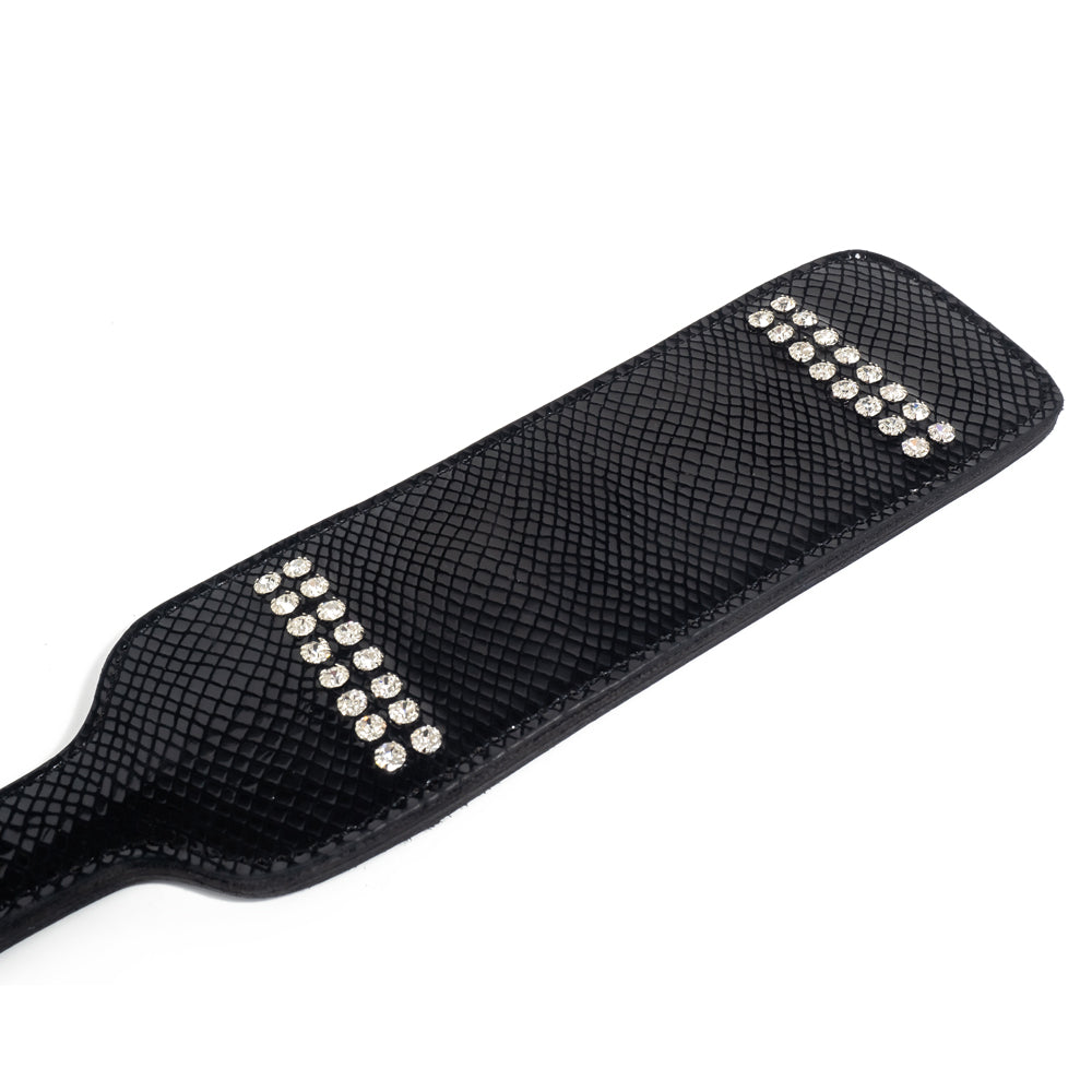 This glamorous BDSM spanker has two sets of dual rows of stunning diamantes against a textured snakeskin face for a sleek and stylish aesthetic that looks great in any bedroom setting or at fetish parties. The snakeskin pattern combines glossy patent leather with a soft suede backing for a velvety-soft finish overall. The other side of the paddle is made from smooth, supple saddle leather for an untextured finish that feels satisfyingly firm with every impact you deliver on your sub's skin! After a few playful warmup swats, try rubbing the paddle over the skin in circular motions to soothe their sensitive skin and keep them on their toes...