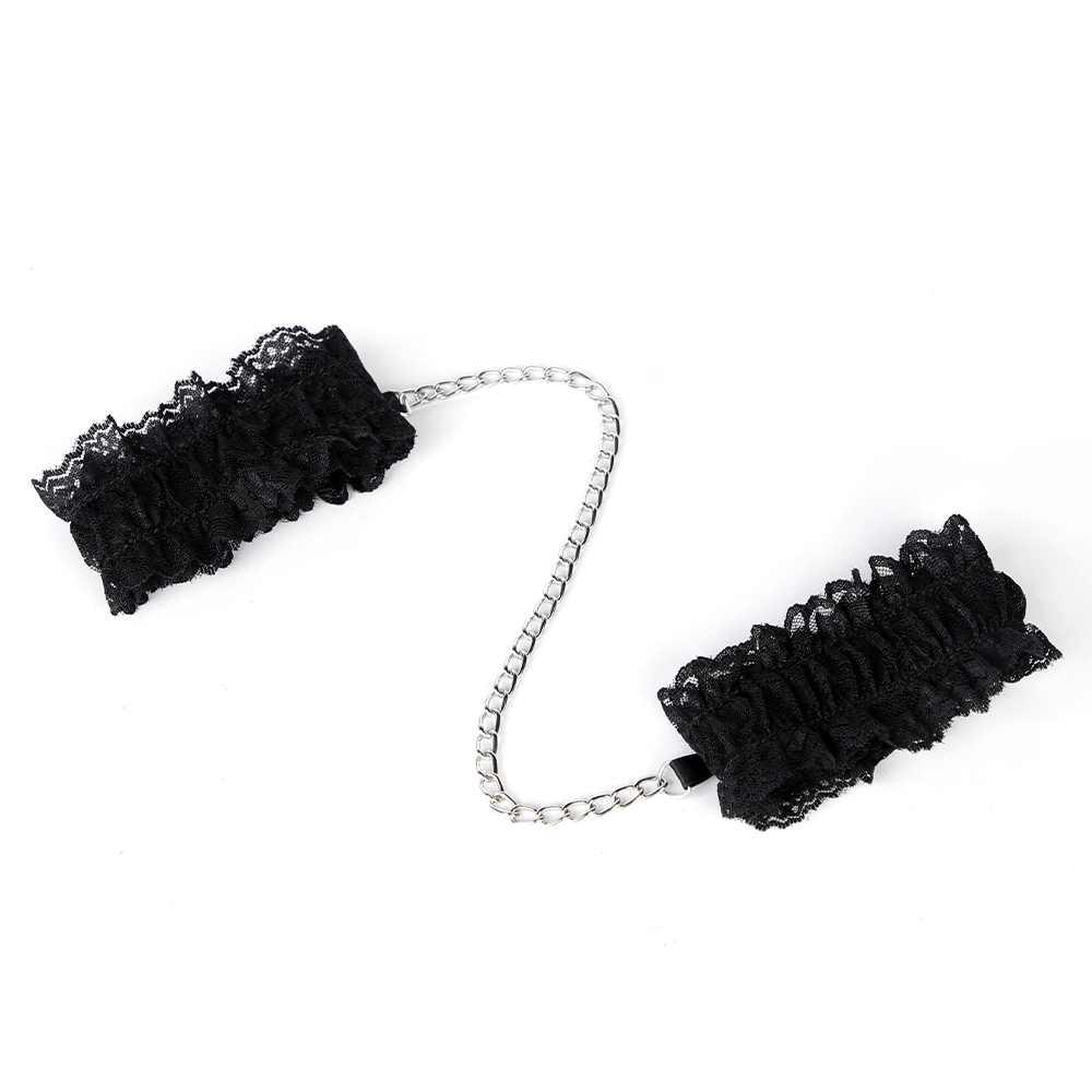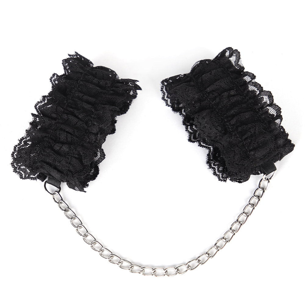 These elegantly erotic cuffs feature a gorgeous gothic-inspired design and are made from ruffle lace, complete with a scalloped edge for an extra feminine touch. The elasticated design ensures a comfortable, snug fit on any wearer's wrist size while the metal chain joins the cuffs to each other via their attached mini D-rings. Slip on these cuffs with a sexy maid costume or with your favourite lace lingerie set and get ready to take your lover's breath away...